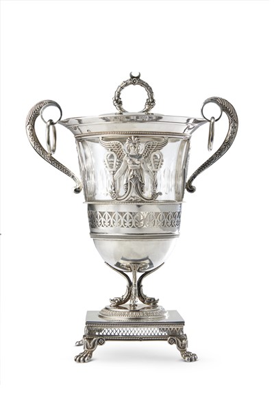 Empire silver drageoir, perforated and engraved with a biansata cup and lid, base with ferini feet, inside in cut crystal. Paris, 1809-1819. Silversmith Marc Augustin Lebrun (g net 700) (h. cm 25) (minor defects)
