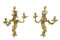 Coppia di applique in bronzo dorato a tre fiamme con portacandele sorretti da volute fogliate e fiori. Secolo XIX (h. cm 60) (difetti)