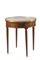 Tavolino da salotto di forma circolare a due cassetti e due tiretti nella fascia, piano in marmo incassato decorato da ringhiera traforata, gambe tornite e scanalate. Francia, inizio secolo XX (h. cm 70, d. cm 64) (difetti)