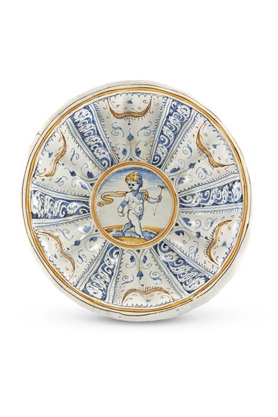 Manifattura di Faenza, fine secolo XVI. Coppa baccellata in maiolica dipinta in policromia con amorino nel cavetto, bordura con motivi a ricamo e festoni a fasce (h. cm 12, d. cm 30) (difetti e probabili restauri)