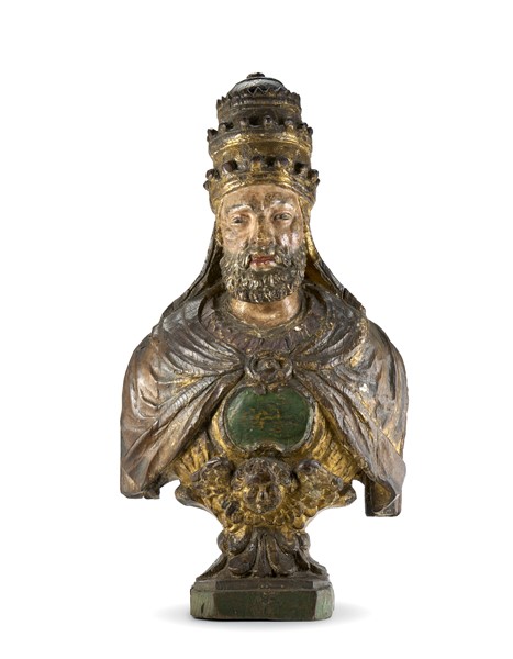 Art of the 17th-18th century. Reliquary bust depicting Holy bishop in carved wood, partially painted and gilded, centered by cartouche above cherub. On octagonal base in faux marble (h. cm 67) (defects and restorations)