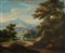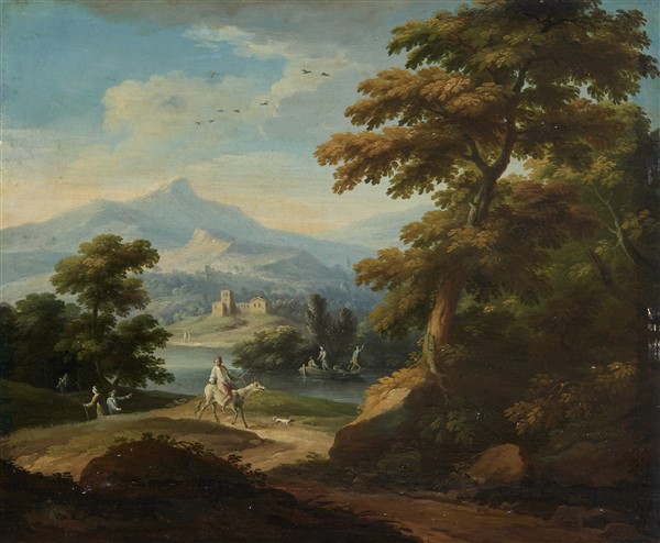 Scuola veneta del secolo XVIII "Paesaggio con viandanti e contadino a cavallo"