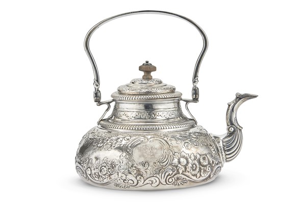 Lot 687 | Teiera da Samovar in argento sbalzato a fiori, foglie e volute, versatoio decor