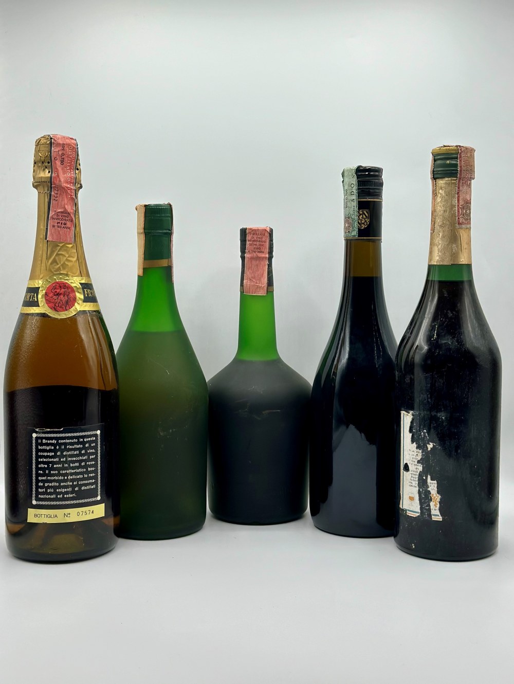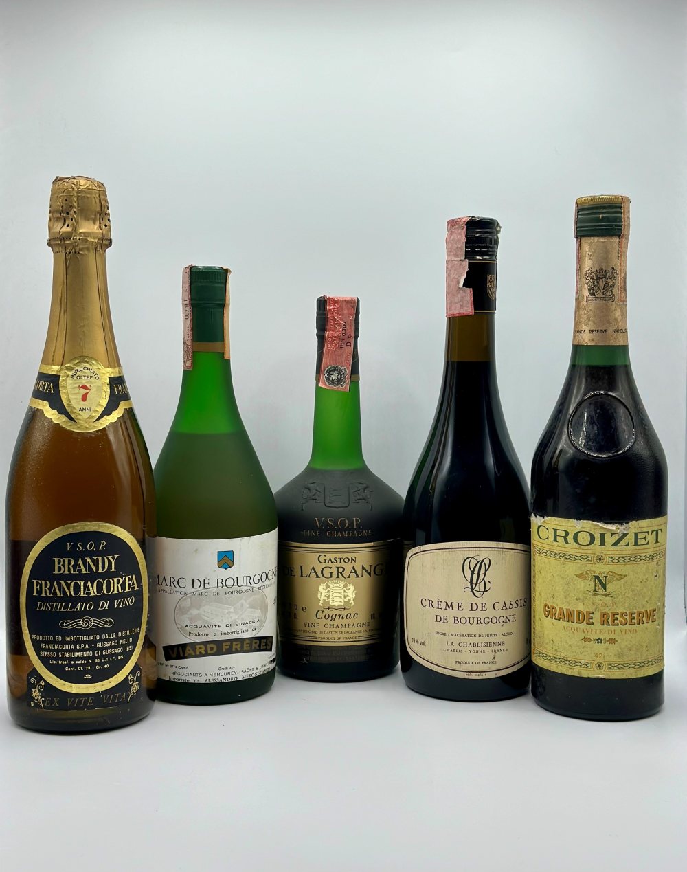 Varie 0,7 Brandy Franciacorta; Acquavite di vinaccia; Cognac; Crème de Cassis; Acquavite di vino Italia; Francia 5 bt BN