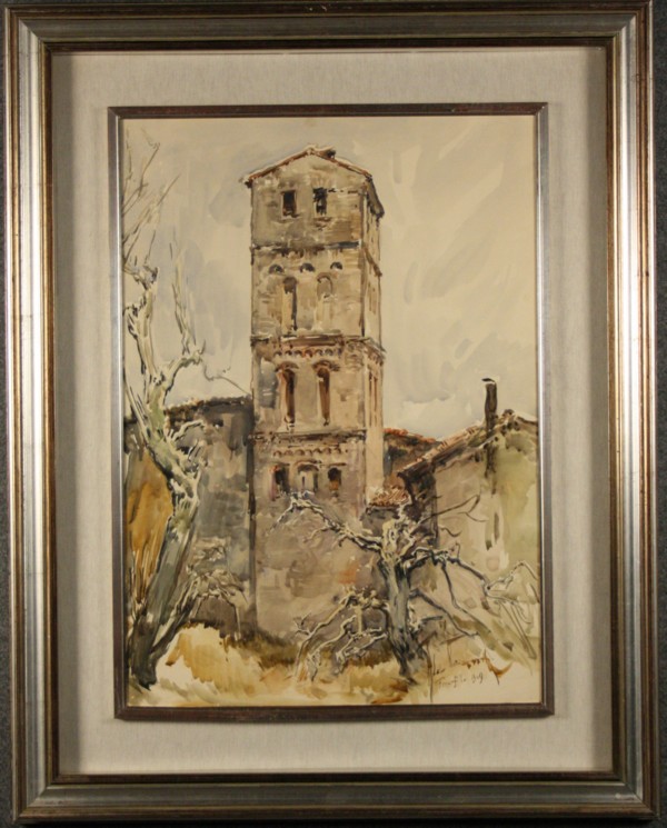 RAIMONDI ALDO - Nato a Roma nel 1902. Morto ad Erba (Como) nel 1998. Acquarello su cartoncino raff. ''CAMPANILE''. Firmato e datato 1969 in basso a destra. In cornice. Mis. Lung. cm. 50 Alt. cm. 70 ca.