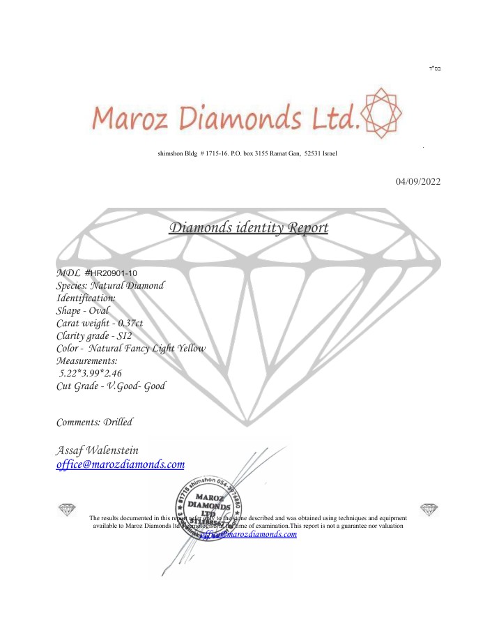 DIAMANTE "DRILLED" 0,37 CARATI COLORE FANCY GIALLO CHIARO - PUREZZA SI2 - TAGLIO OVALE - CERTIFICATO GEMMOLOGICO MAROZ DIAMONDS LTD MEMBRO ISRAEL DIAMOND EXCHANGE - DRILLED = perforato. La perforazione laser è un trattamento utilizzato per ridurre la visibilità delle inclusioni naturali scure che riducono il grado di purezza di un diamante. Si tratta di perforare con un raggio laser un minuscolo tunnel attraverso il diamante, al fine di rimuovere una macchia scura sepolta all'interno della pietra. - HR20901-10