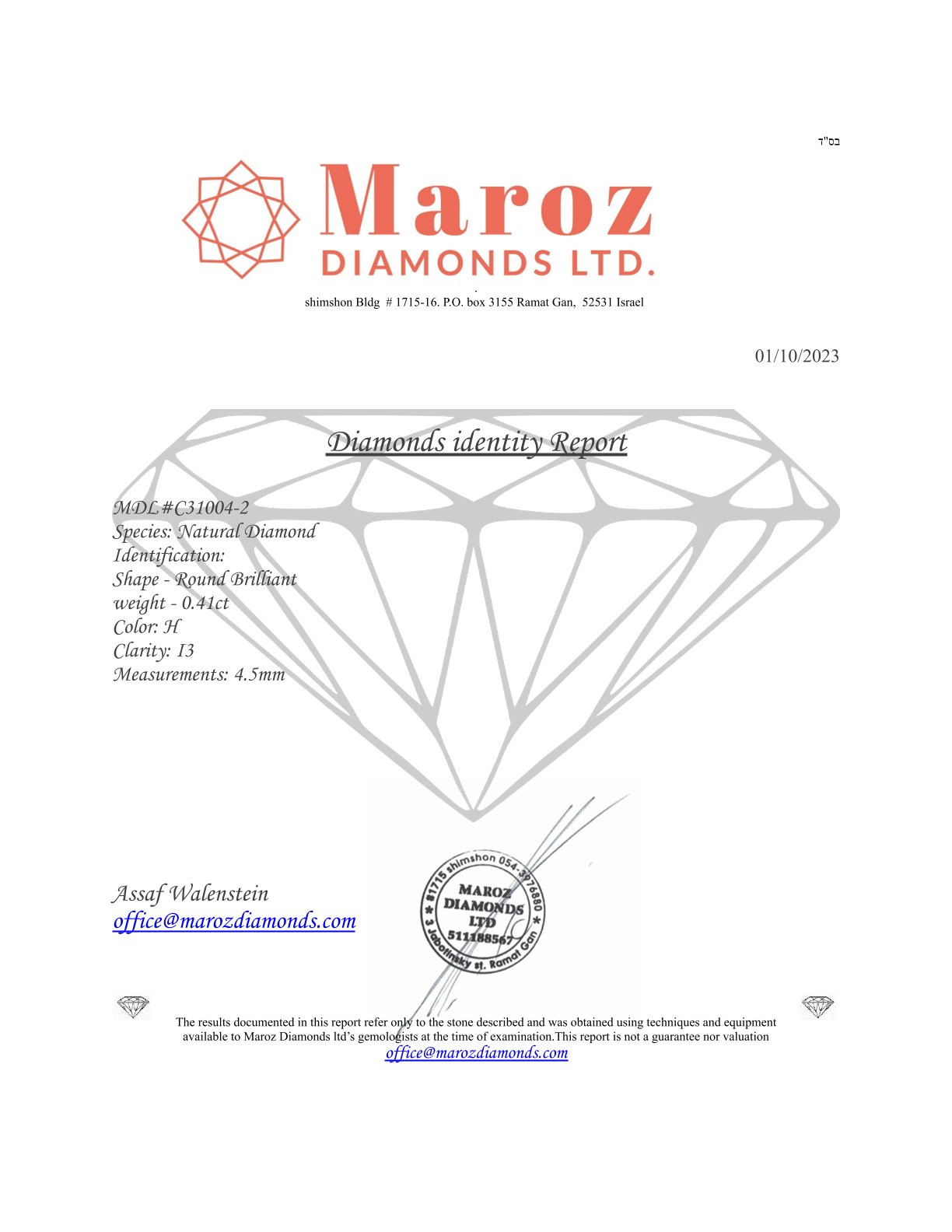 DIAMANTE 0,41 CARATI COLORE H - PUREZZA I3 - TAGLIO BRILLANTE - CERTIFICATO GEMMOLOGICO MAROZ DIAMONDS LTD MEMBRO ISRAEL DIAMOND EXCHANGE - C31004-2