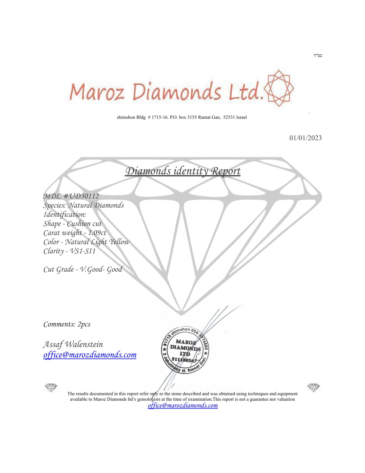 2 DIAMANTI NATURAL POLISHED 1,09 CARATI COLORE GIALLO CHIARO - PUREZZA VS1-SI1 - TAGLIO CUSCINO - CERTIFICATO GEMMOLOGICO MAROZ DIAMONDS LTD MEMBRO ISRAEL DIAMOND EXCHANGE - UD30112