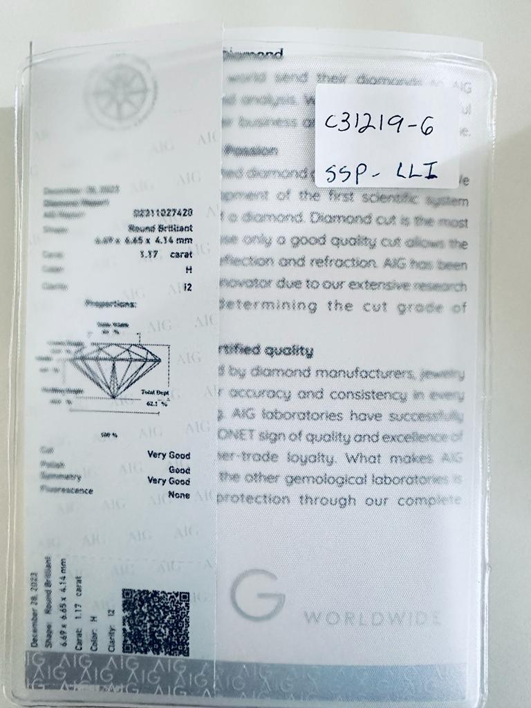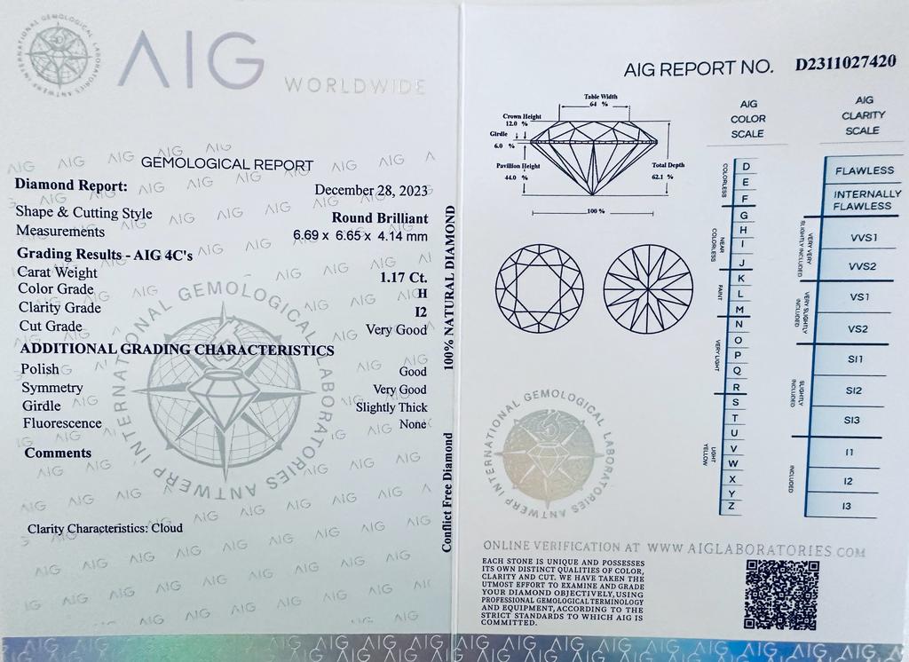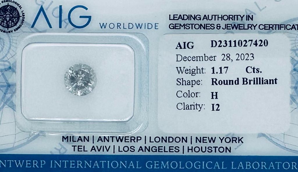 DIAMANTE 1,17 CARATI COLORE H - PUREZZA I2 - TAGLIO BRILLANTE - CERTIFICATO AIG - C31219-6
