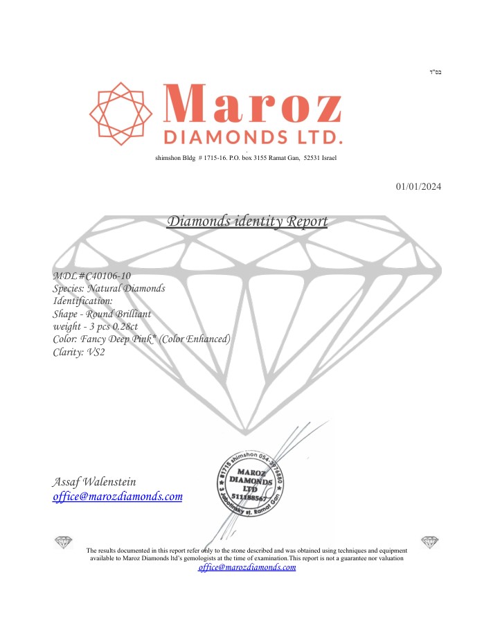 3 DIAMANTI COLORE ESALTATO 0,28 CARATI COLORE FANCY ROSA INTENSO - PUREZZA VS2 - TAGLIO BRILLANTE - CERTIFICATO GEMMOLOGICO MAROZ DIAMONDS LTD MEMBRO ISRAEL DIAMOND EXCHANGE - C40106-10