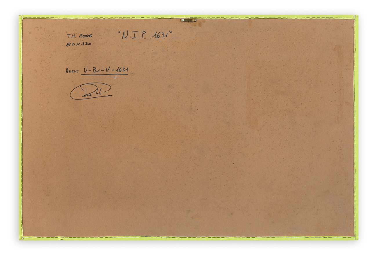 Firma, titolo, datazione, tecnica, misure e numero di archivio al retro