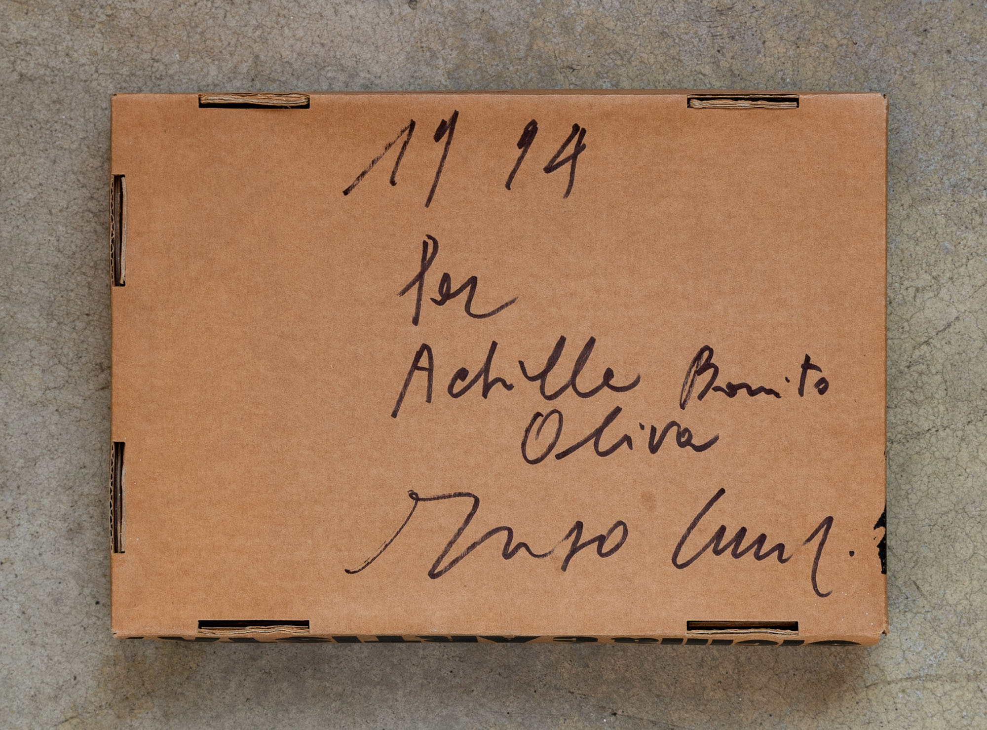 ENZO CUCCHI(1949)Sicilia è artista1994Scatola in cartone contenente catalogo-poster edito in occasione della mostra tenutasi presso la Reggia di Caserta (1994), firmato e dedicato 'per Achille Bonito Oliva' al retro25,5 x 26 cmEdizione del museoDifetti