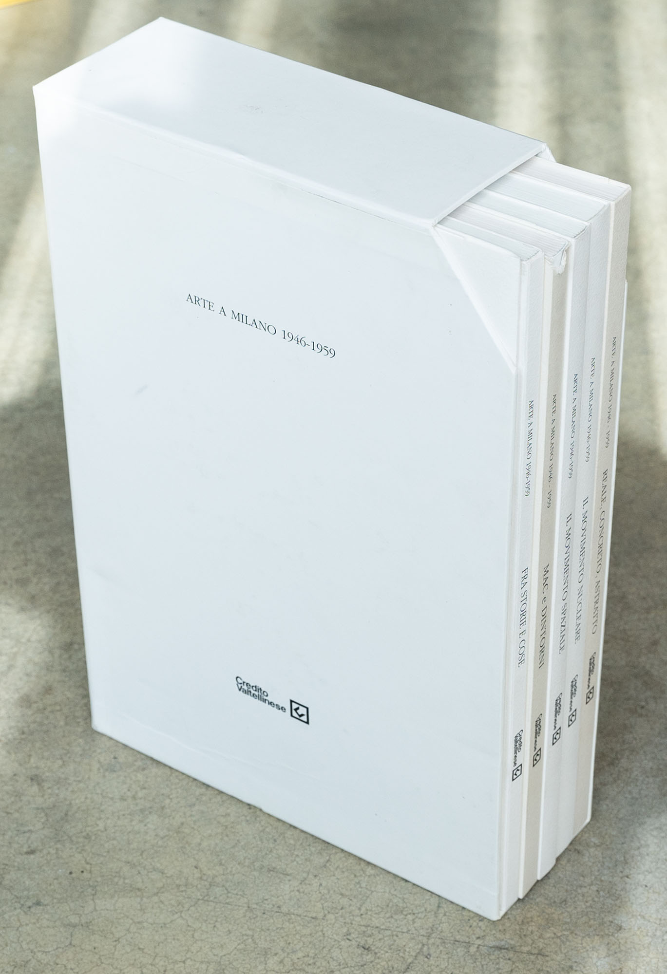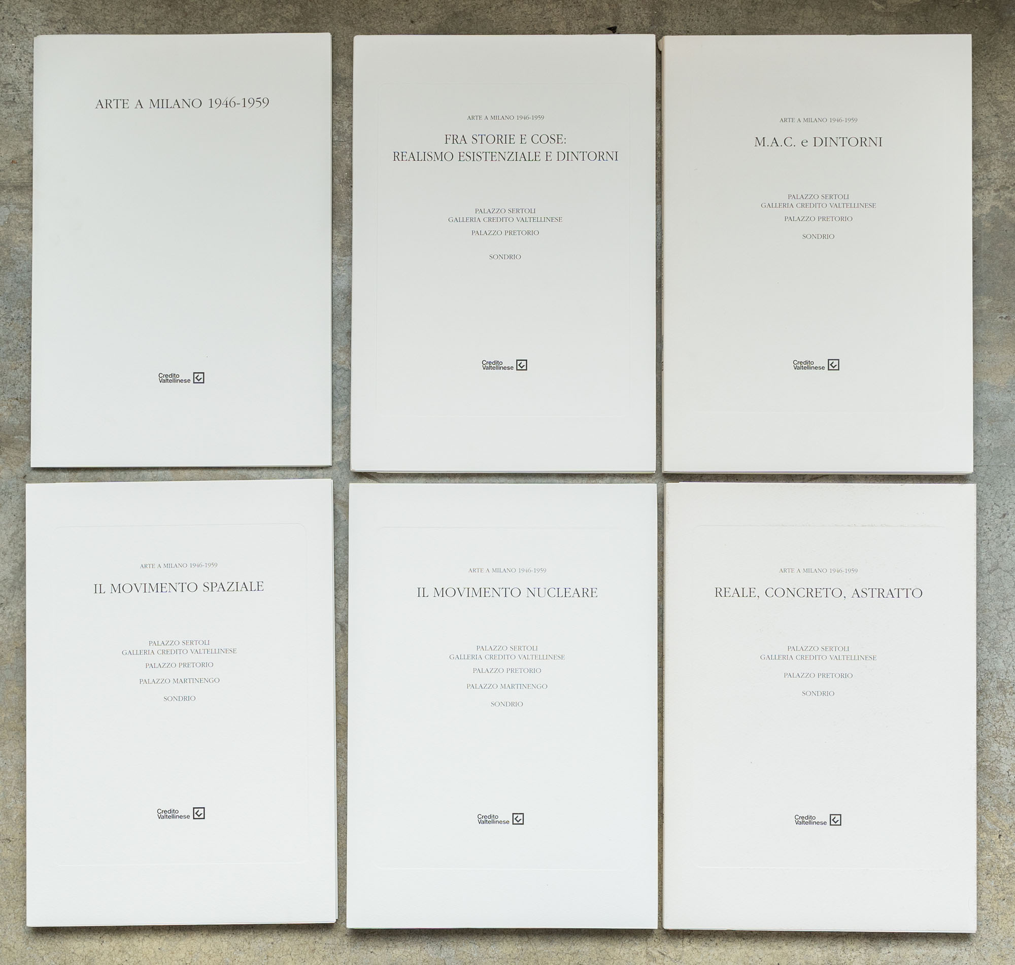 LOTTO MULTIPLOArte a Milano 1946 - 19591999Cofanetto contenente cinque cataloghi illustrati editi in occasione delle mostre tenutesi presso il Palazzo Sertoli, Sondrio (1997 - 1999)35 x 24 x 8,5 cmEdizione Credito ValtellineseDifetti