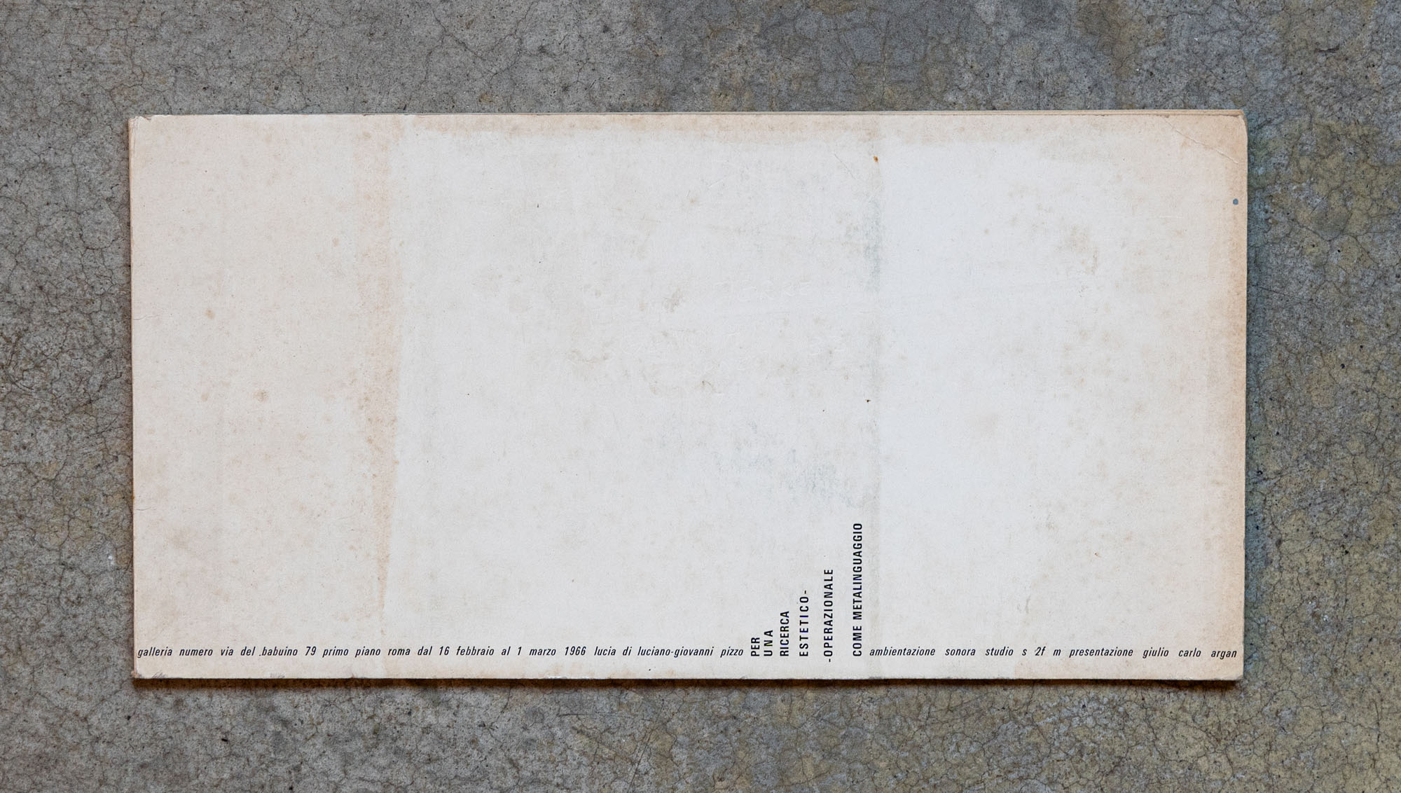 AUTORI VARIPer una ricerca estetico-operazionale come metalinguaggio1966Catalogo illustrato edito in occasione della mostra tenutasi presso la Galleria Numero, Roma (16 febbraio - 1 marzo 1966)13,2 x 26 cmEdizione della galleriaDifetti