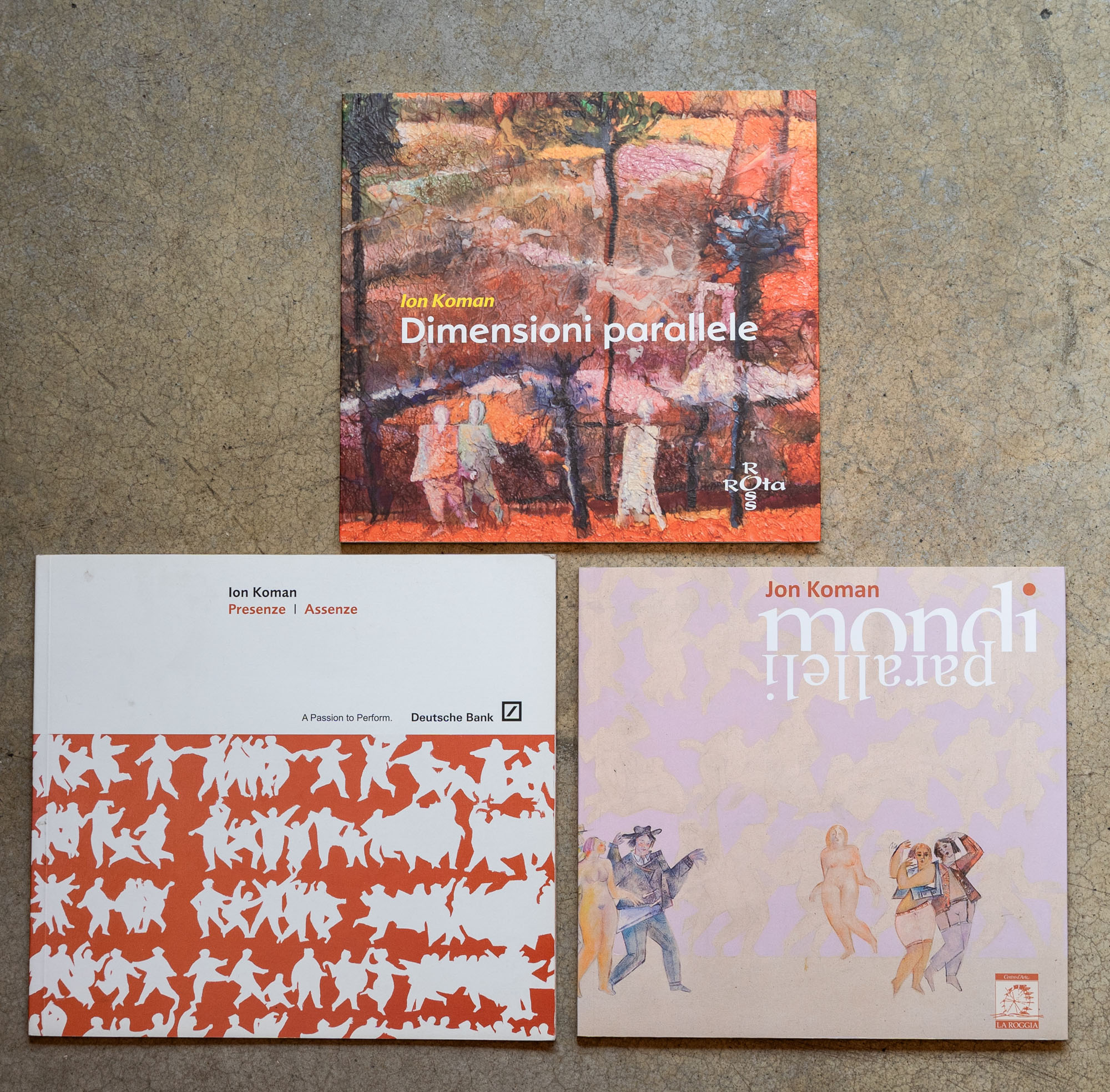 ION KOMAN(1954)Lotto di tre cataloghiPresenze / Assenze2010Catalogo illustrato edito in occasione della mostra tenutasi presso Silvy Bassanese Arte Contemporanea, Biella (ottobre - novembre 2010), con disegno e firma all'interno22 x 24 cmEdizione della galleriaPagine 48Senza difettiDimensioni parallele2013Catalogo illustrato edito in occasione della mostra tenutasi presso la Galleria Arte Rotaross, Novara (13 aprile - 11 maggio 2013), con disegno e firma all'interno21 x 22 cmEdizione della galleriaPagine 48Senza difettiMondi paralleli2011Catalogo illustrato edito in occasione della mostra tenutasi presso Centro d'Arte La Roggia, Conegliano (25 novembre - 15 dicembre 2011), con disegno e firma all'interno21 x 22 cmEdizione della galleriaPagine 48Senza difetti
