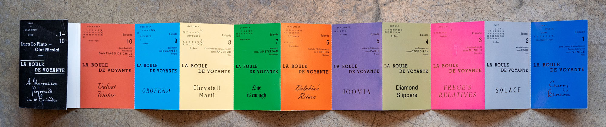 Libro d'artista che documenta il progetto artistico di Olaf Nicolai e Luca lo Pinto realizzato in dieci shede che rappresentano le performance tenutesi tra maggio e dicembre 2009 in dieci diverse città europee