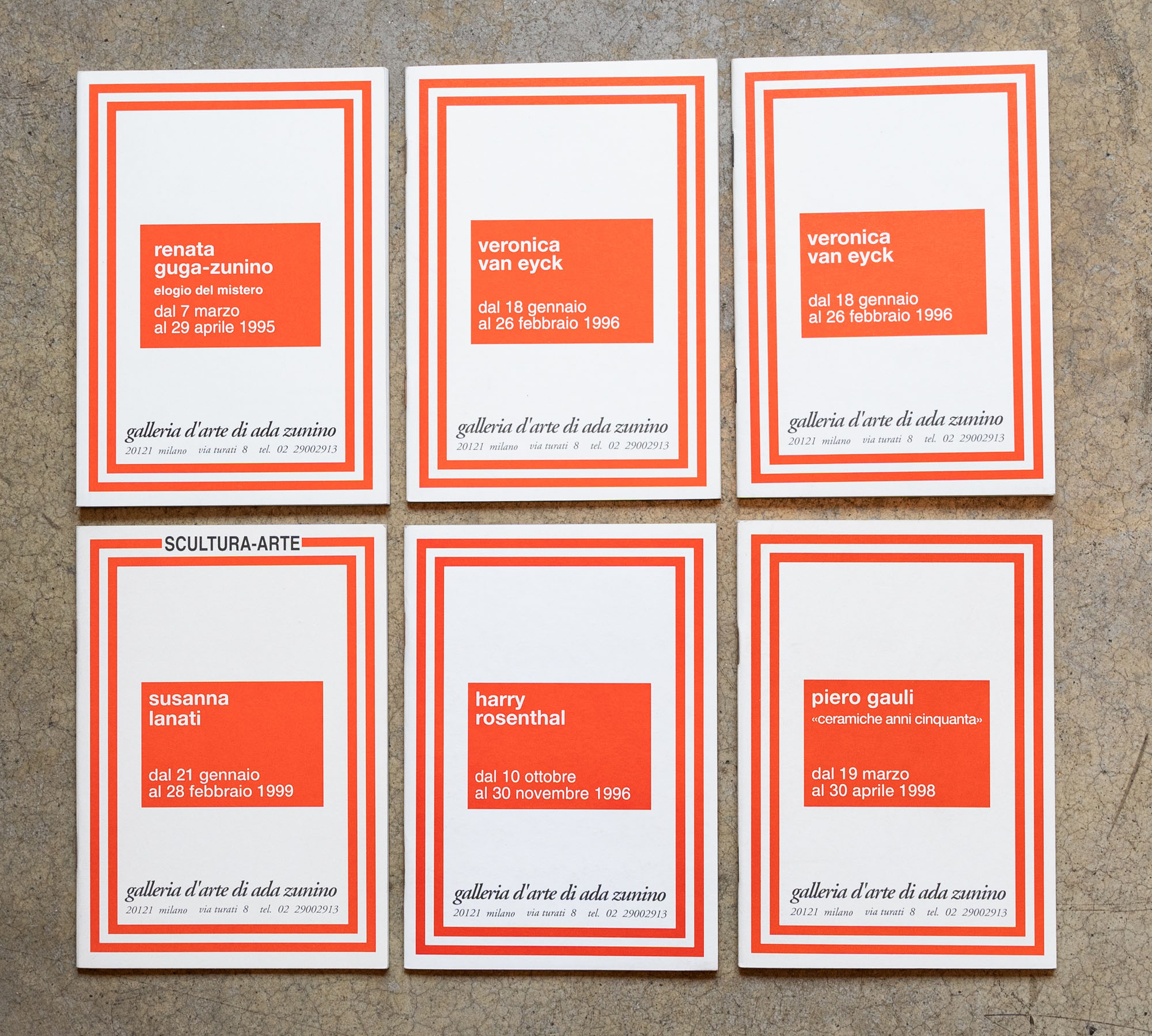 LOTTO MULTIPLOLotto di sei pubblicazioniDal 1995 al 1999Realizzate in occasione delle mostre di Veronica Van Eyck, Susanna Lanati, Piero Gauli, Harry Rosenthal e Renata Guga-Zunino tenutesi presso la Galleria d'Arte di Ada Zunino, Milano17 x 12 cmEdizioni della galleriaSenza difetti