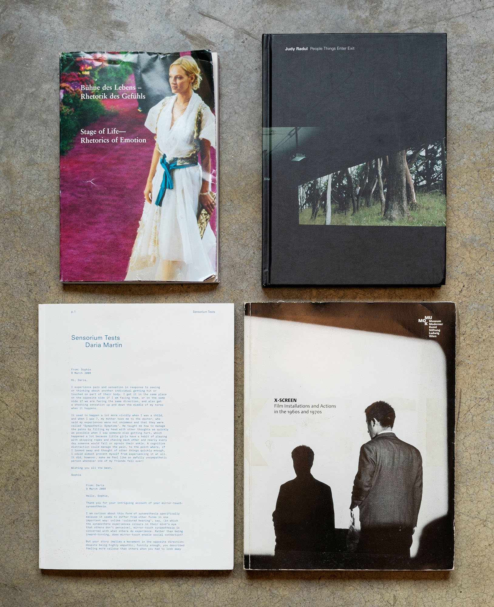 LOTTO MULTIPLOLotto di quattro cataloghiBühne des Lebens - Rhetorik des gefühls / Stage of life. Rhetorics of emotions2006Catalogo illustrato edito in occasione della mostra tenutasi presso la Städtische Galerie im Lenbachhaus, Monaco di Baviera (8 aprile - 9 luglio 2006)24 x 16,5 cmEdizone della galleria Pagine 168Difetti Judy Radul - People things enter exit2005Catalogo illustrato edito in occasione della mostra 'Judy Radul: Downew Point And So Departed (Again)' tenutasi presso la House Gallery, Vancouver (17 settembre - 30 ottobre 2005)26 x 19 cmEdizione della galleriaPagine 176DifettiX-SCREEN. Film installations and actions in the 1960s and 1970s2003Catalogo illustrato edito in occasione della mostra tenutasi presso il MUMOK, Vienna (13 dicembre 2003 - 29 febbraio 2004)28 x 22 cmEdizione del museoPagine 208DifettiDaria Martin - Sensorium tests2012Catalogo illustrato edito in occasione della mostra tenutasi presso la MK Gallery, Milton Keynes (20 gennaio - 8 aprile 2012)28 x 20,5 cmEdizione della galleriaPagine 152Difetti