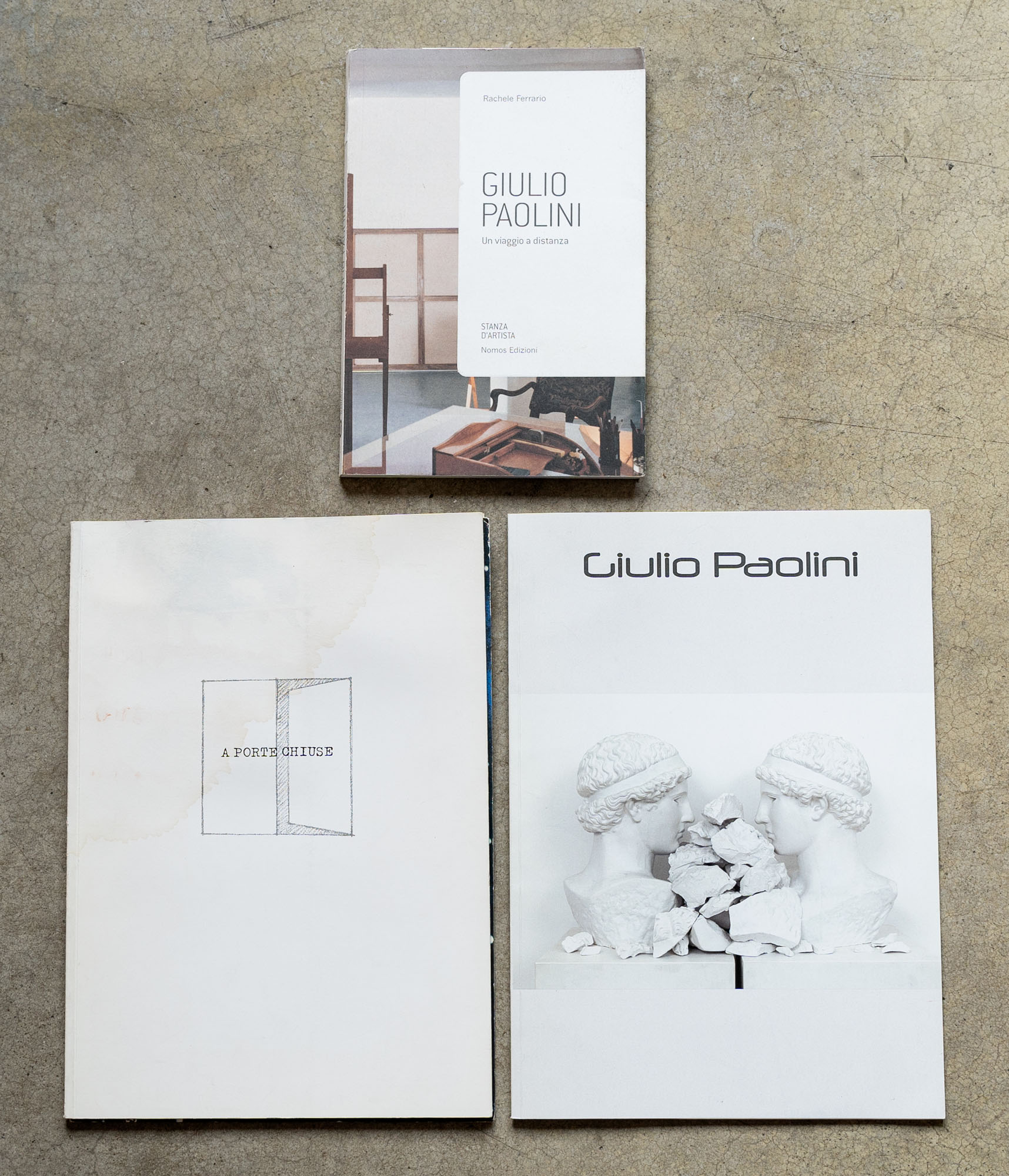 GIULIO PAOLINI(1940)Lotto di tre cataloghiUn viaggio a distanza2009Catalogo monografico illustrato 22 x 15 cmNomos EdizioniPagine 144DifettiRaccolta di opere2014Catalogo monografico illustrato edito in occasione della mostra tenutasi presso la galleria Artevalori, Milano (giugno - luglio 2014)29,8 x 21 cmEdizione della galleriaPagine 44DifettiA porte chiuse1998Catalogo monografico illustrato edito in occasione della mostra tenutasi presso la Galleria Massimo Minini, Brescia (dicembre 1998), es. non numerato su una tiratura complessiva di 1000 esemplari29,5 x 21 cmEdizione della galleriaPagine 32Difetti