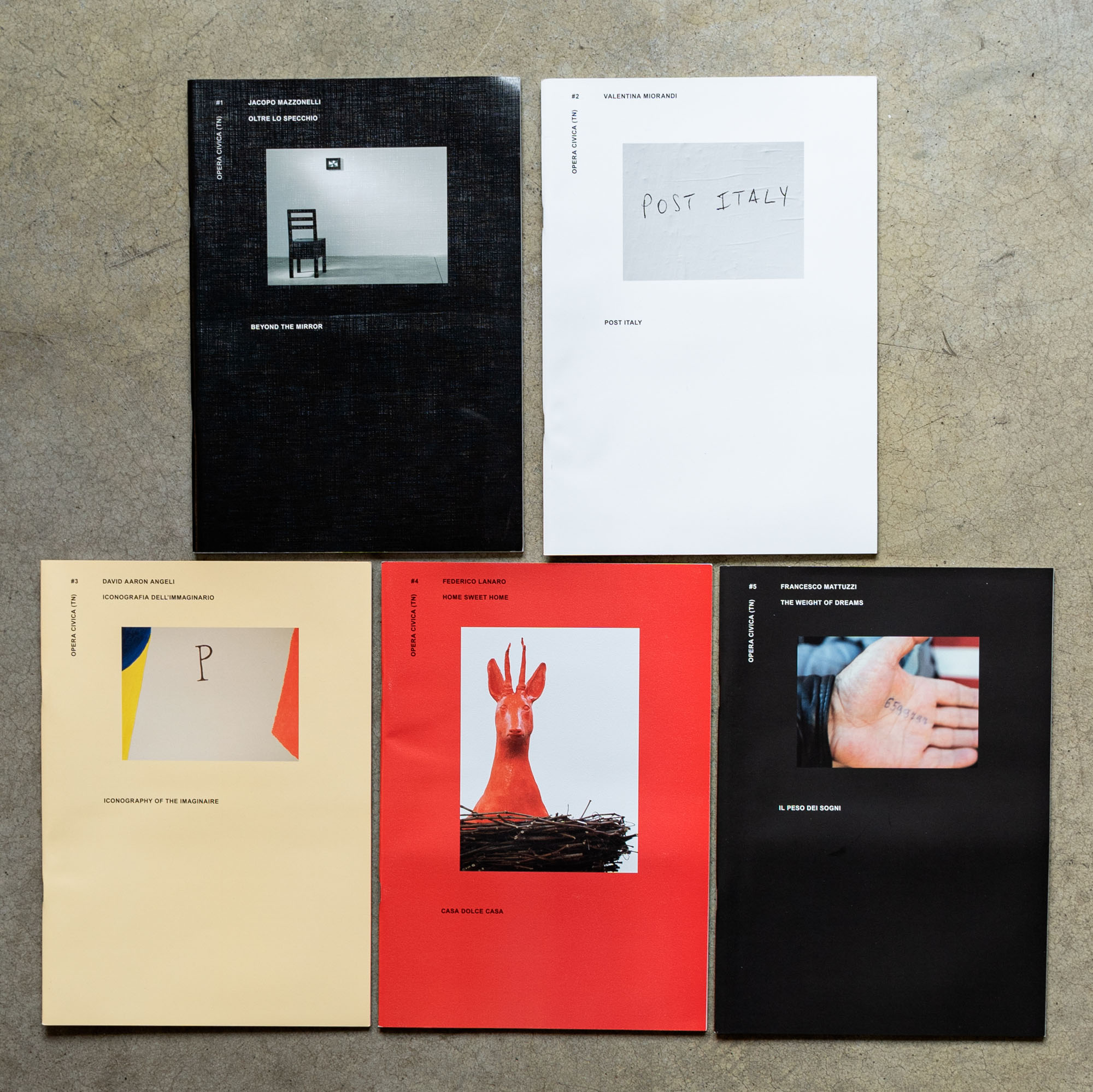 LOTTO MULTIPLOLotto di cinque cataloghi2010Cataloghi illustrati editi in occasione delle mostre di Jacopo Mazzonelli, Valentina Morandi, David Aaron Angeli, Federico Lanaro e Francesco Mattuzzi in collaborazione con il progetto Opera Civica di Trento (2010 - 2011)30 x 21 cmEdizione Kaleidoscope PressSenza numero di pagineDifetti