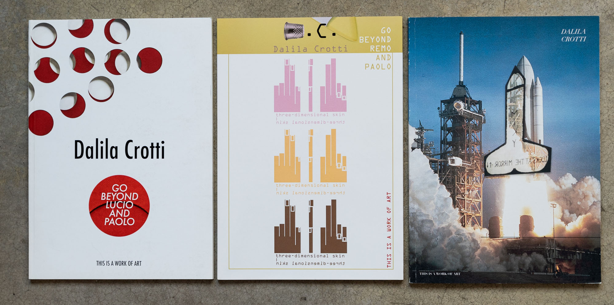 DALILA CROTTI(1983)Lotto di tre cataloghiGo beyond Remo and Paolo2008Catalogo illustrato edito in occasione della mostra tenutasi presso la National Gallery, Camberra (ottobre 2006)29,5 x 21 cmEdizione del museoPagine 67DifettiGo beyond Lucio and Paolo2008Catalogo illustrato edito in occasione della mostra tenutasi presso M.C.A., Sidney (dicembre 2008)29,5 x 21 cmEdizione del museoPagine 72DifettiDalila Crotti2010Catalogo illustrato edito in occasione della mostra tenutasi presso il Portland Art Museum, Portland (gennaio 2010)29,5 x 21 cmEdizione del museoPagine 99Difetti