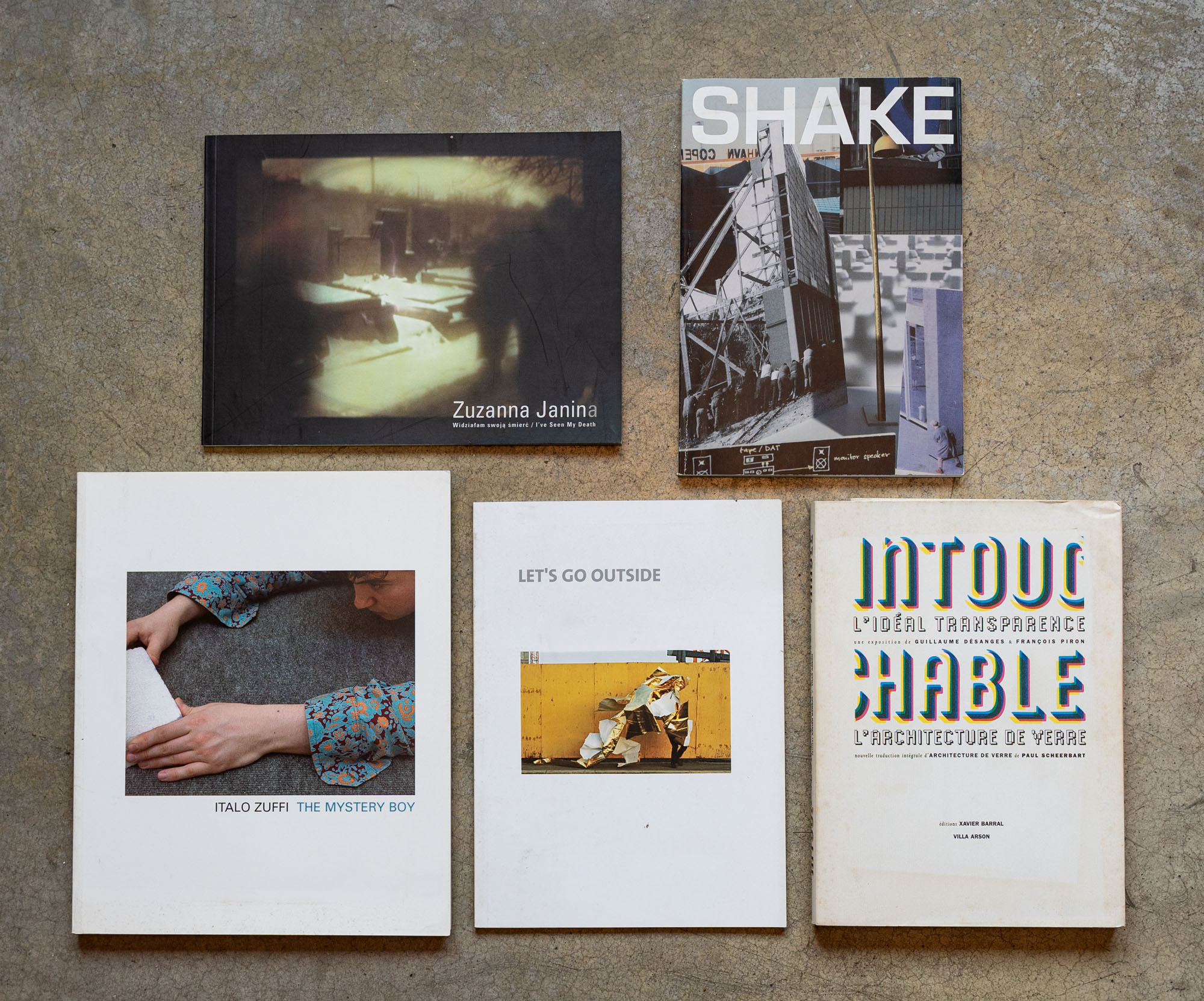 LOTTO MULTIPLOLotto di cinque cataloghiSession work 2005Catalogo illustrato22,5 x 16 cmEdizione Pork Salad PressPagine 114DifettiZuzanna Janina - Widzialam swoja smierc / I've seen my death2003Catalogo illustrato 18 x 24 cmPagine 40 DifettiIntouchable. L'idéal transparence, l'architecture de verre2006Catalogo illustrato edito in occasione della mostra tenutasi presso il Centro Nazionale d'Arte Contemporanea di Villa Arson, Nizza (1 luglio - 24 settembre 2006)23,5 x 17 cmEdizione della galleriaPagine 224DifettiLet's go outside2010Catalogo illustrato edito in occasione della mostra tenutasi presso il Superstudio Più, Milano (22 - 30 marzo 2010)24 x 17,5 cmEdizione Alternative TechnologiesSenza numero di pagineDifettiItalo Zuffi - The mystery boy2003Catalogo illustrato 26 x 21,3 cmEdizione Galleria ContinuaPagine 160Difetti