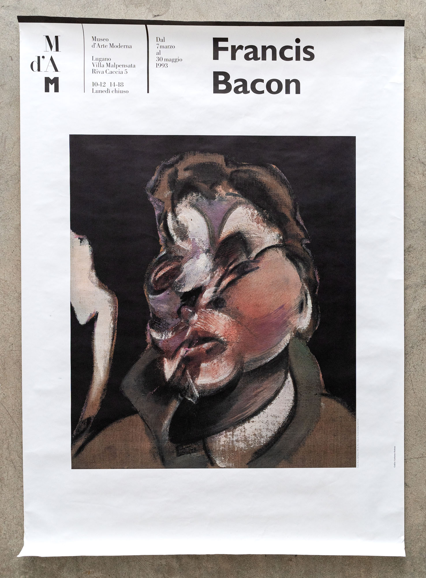 FRANCIS BACON(1909 - 1992)Francis Bacon1993Manifesto edito in occasione della mostra tenutasi presso il Museo d'Arte Moderna, Lugano (7 marzo - 30 maggio 1993)185 x 90,5 cmDifetti