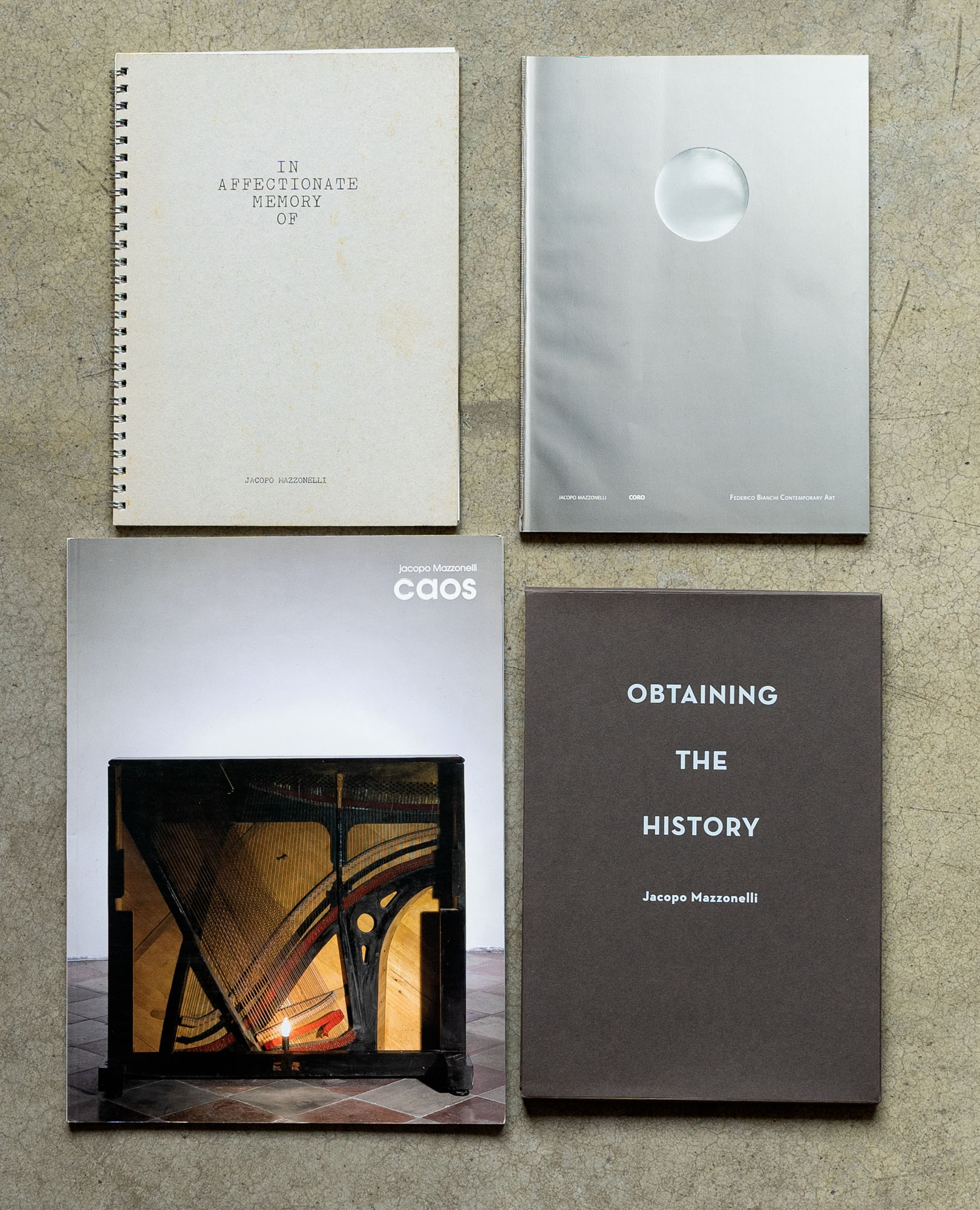 JACOPO MAZZONELLI(1983)Lotto di quattro cataloghiCORO2012Catalogo monografico illustarto edito in occasone della mostra tenutasi presso la Federico Bianchi Contemporary Art, Milano (19 gennaio - 16 marzo 2012)23 x 16,8 cmEdizione della galleriaSenza numero di pagineSenza difettiIn affectionate memory of2011Catalogo illustrato edito in occasione del mostra tenutasi presso la Fondazione Galleria Civica - Cento di Ricerca sulla Contemporaneità, Trento (29 marzo - 8 maggio 2011)23 x 17 cmEdizione del museoSenza numero di pagineDifettiObtaining the history2013Cofanetto contenente tre cataloghi monografici illustrati editi in occasione della mostra tenutasi presso la Paola Maria Deanesi Gallery, Rovereto24 x 17 cmEdizione della galleriaSenza numero di pagineSenza difettiCAOS2010Catalogo monografico illustrato edito in occasione della mostra tenutasi presso la Casa de Gentil, Sanzeno (24 aprile - 30 maggio 2010)28 x 21 cmEdizione della galleriaSenza numero di pagineDifetti