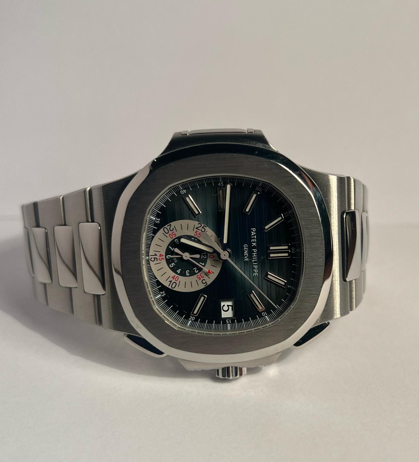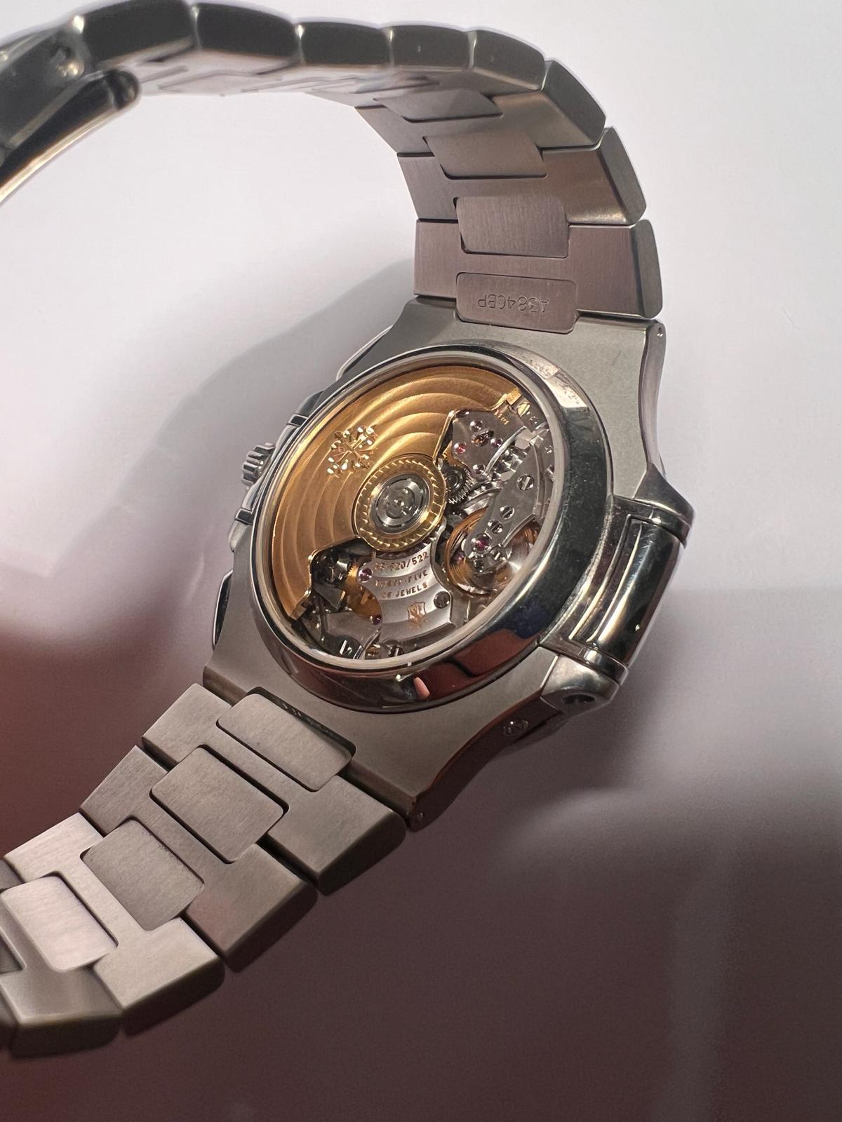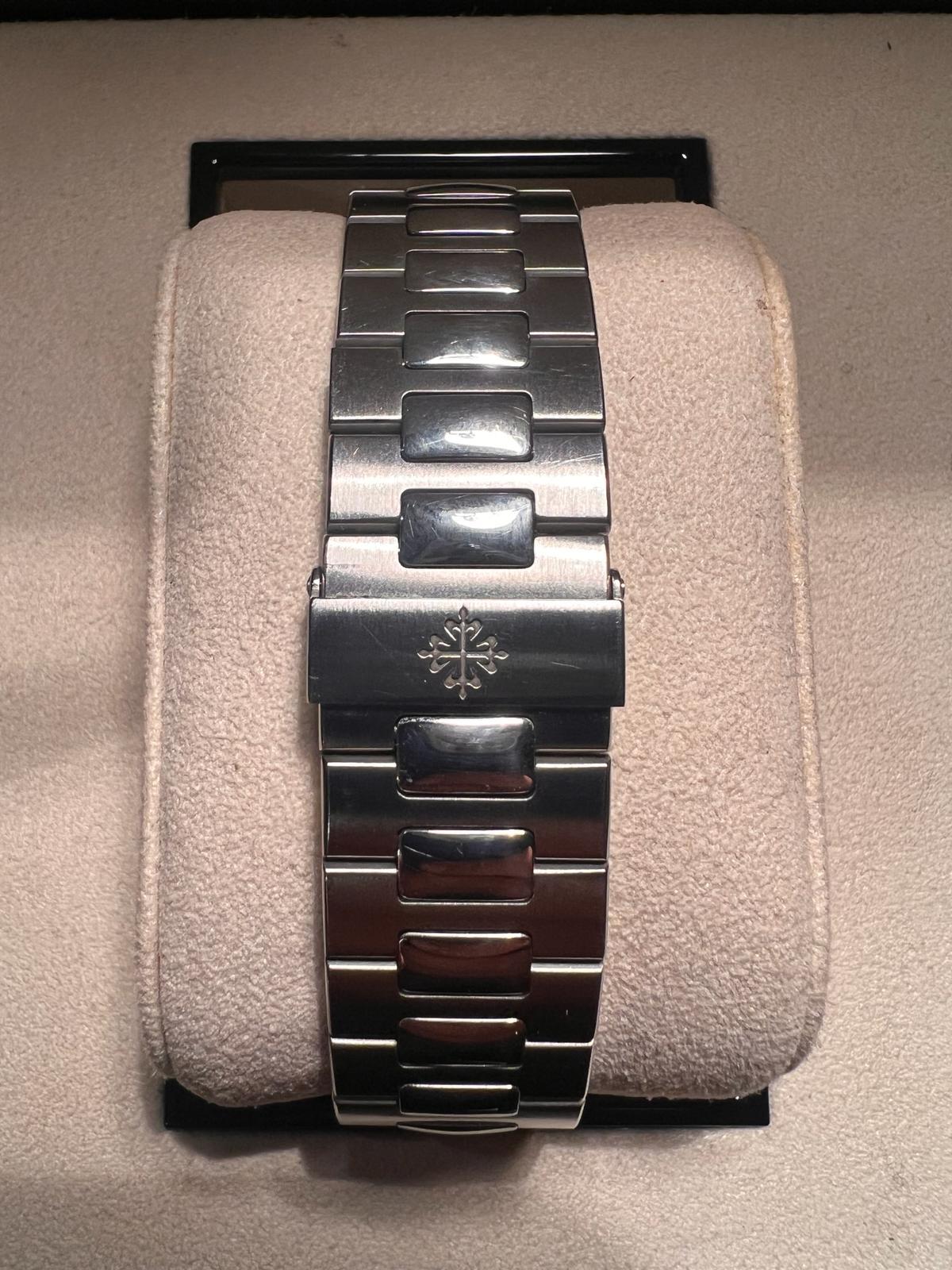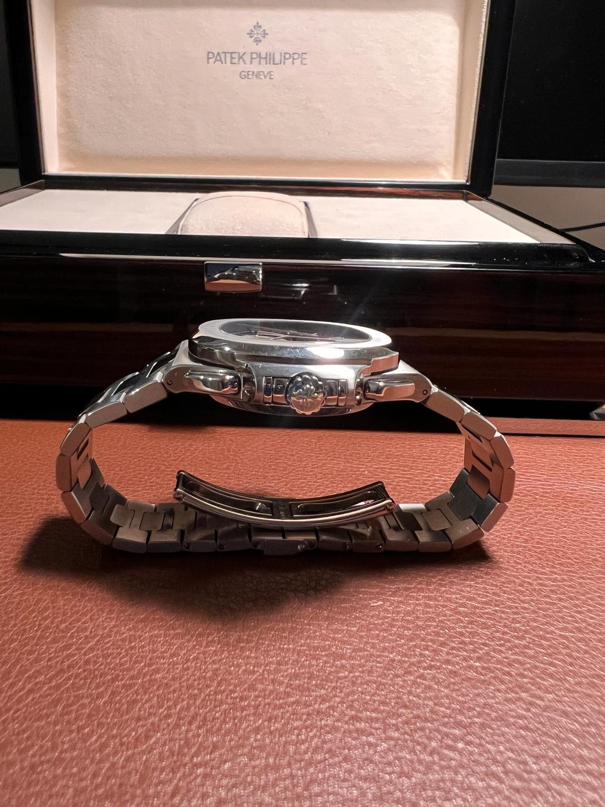 Marca Patek Philippe Modello (Orologio) Nautilus Numero di referenza 5980/1A-001 Carica Automatico Materiale della cassa Acciaio Materiale cinturino Acciaio Anno di produzione 2010 Condizione Ottimo (di seconda mano, segni di usura assenti o appena visibili) Corredo Con scatola originale e documenti originali Calibro Carica Automatico Cassa Materiale della cassa Acciaio Diametro 40.5 x 44 mm Impermeabile 10 ATM Materiale lunetta Acciaio Vetro Vetro zaffiro Numeri sul quadrante Senza numeri Cinturino Materiale cinturino Acciaio Colore cinturino Acciaio Chiusura Doppia chiusura déployante Materiale chiusura Acciaio Funzioni Cronografo, Data