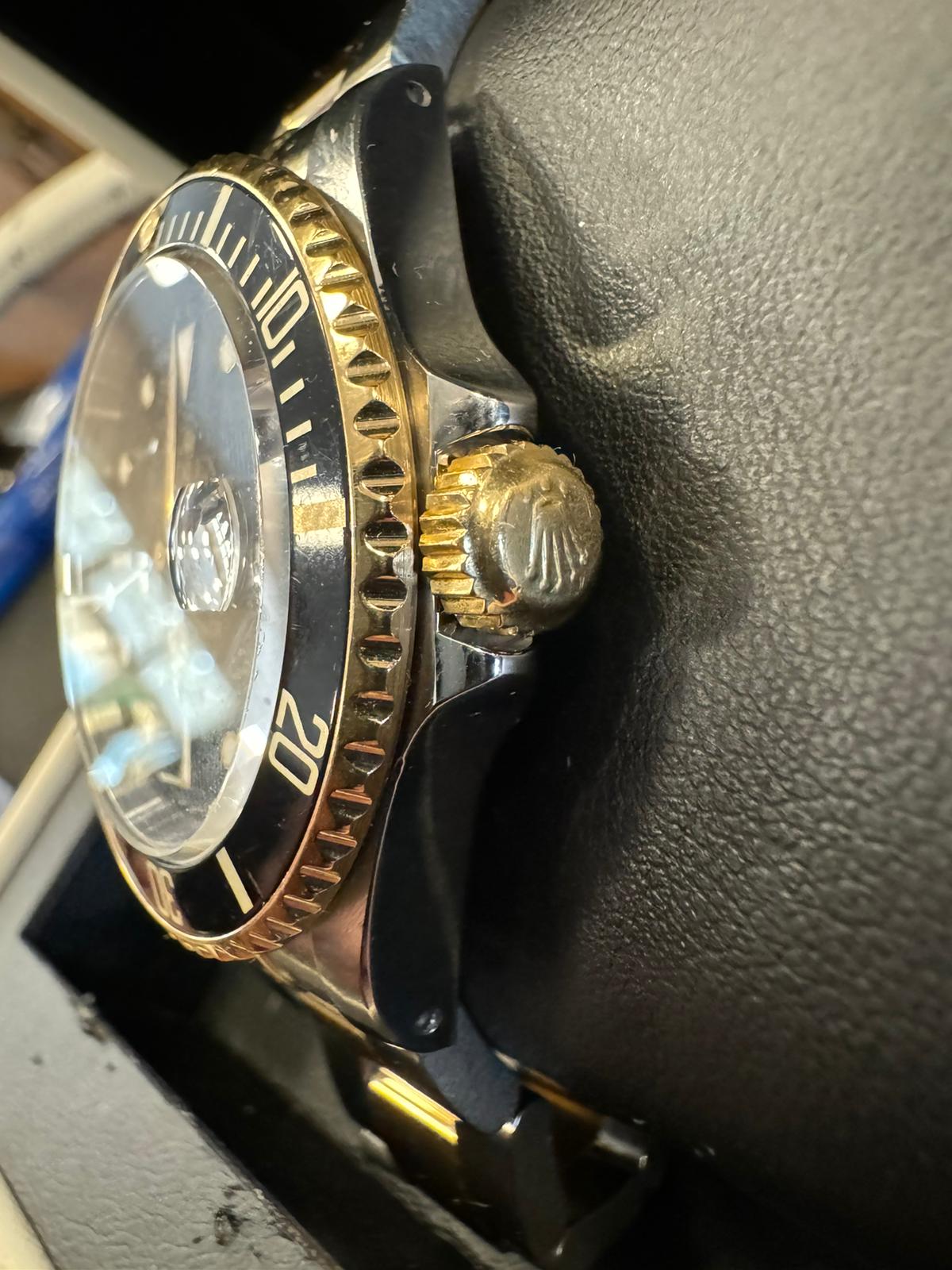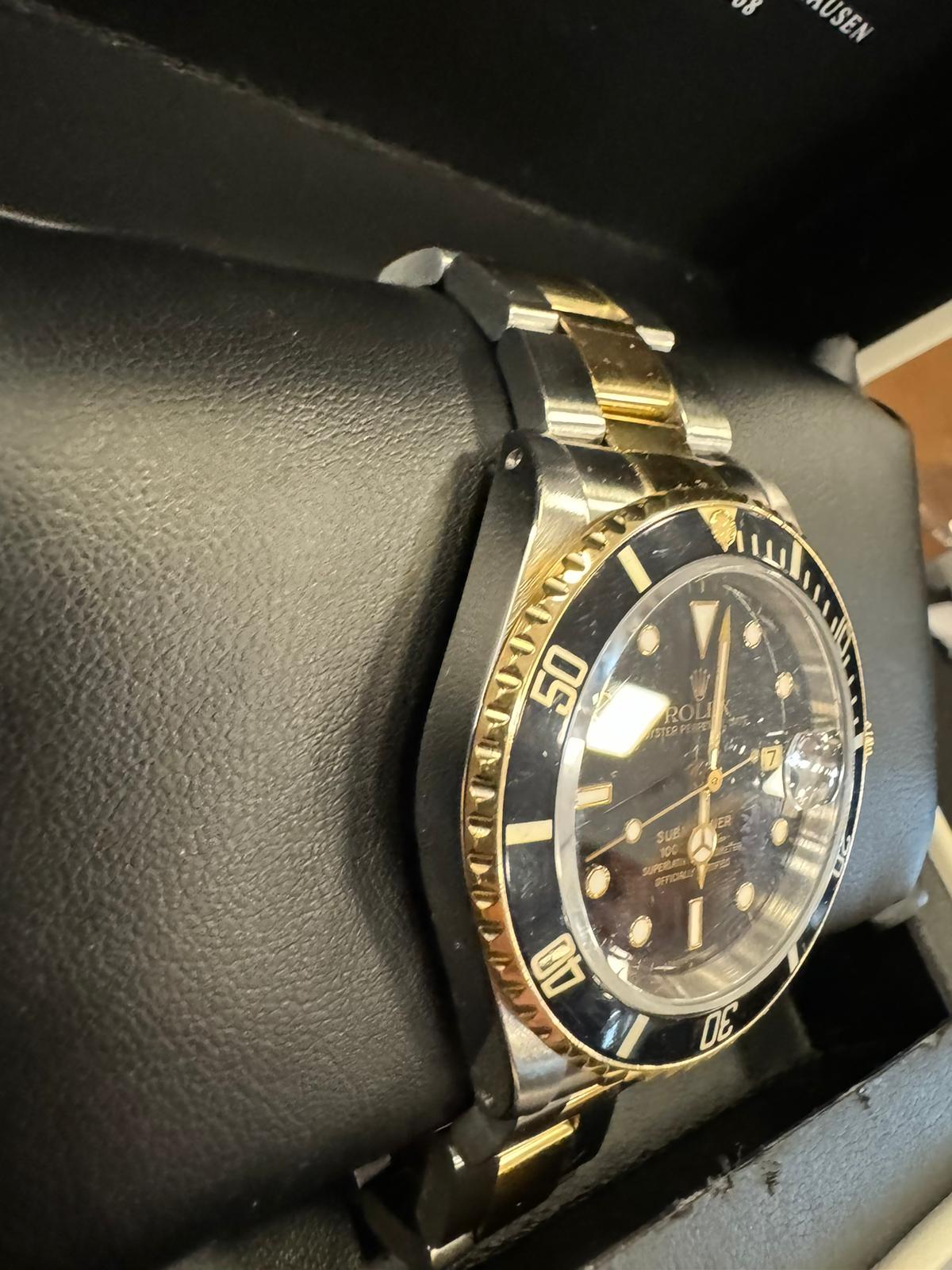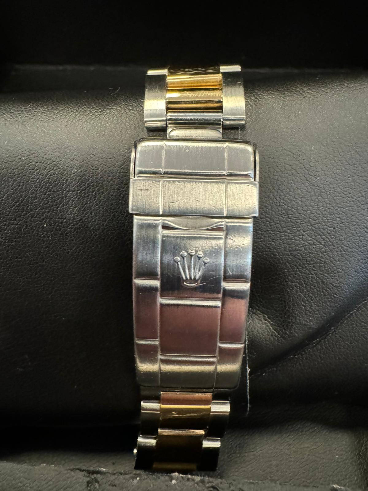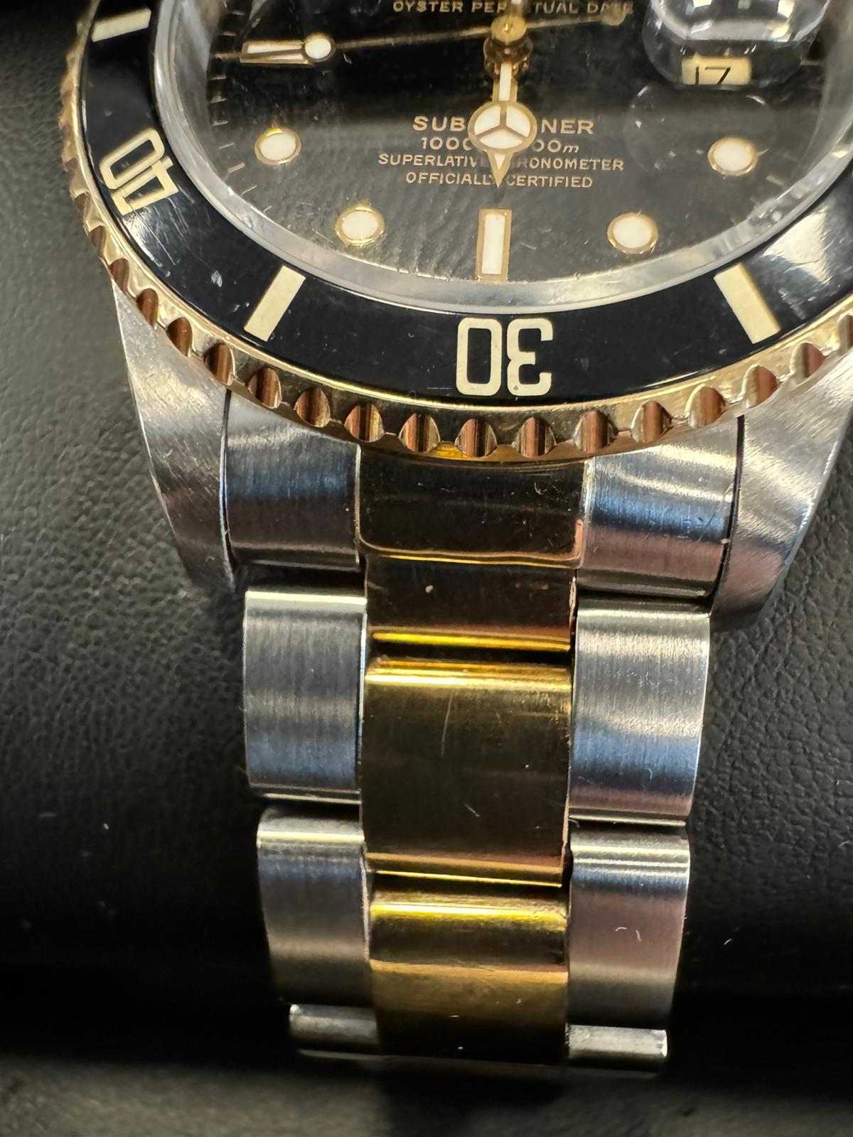 Marca Rolex Modello (Orologio) Submariner Date Numero di referenza 16613 Carica Automatico Materiale della cassa Oro/Acciaio Materiale cinturino Oro/acciaio Anno di produzione 1990 Condizione Ottimo (di seconda mano, segni di usura assenti o appena visibili) Corredo Senza scatola originale, senza documenti originali Cassa Materiale della cassa Oro/Acciaio Diametro 40 mm Impermeabile 30 ATM Materiale lunetta Oro giallo Vetro Vetro zaffiro Numeri sul quadrante Senza numeri Cinturino Materiale cinturino Oro/acciaio Colore cinturino Oro/acciaio Chiusura Déployante Funzioni Data