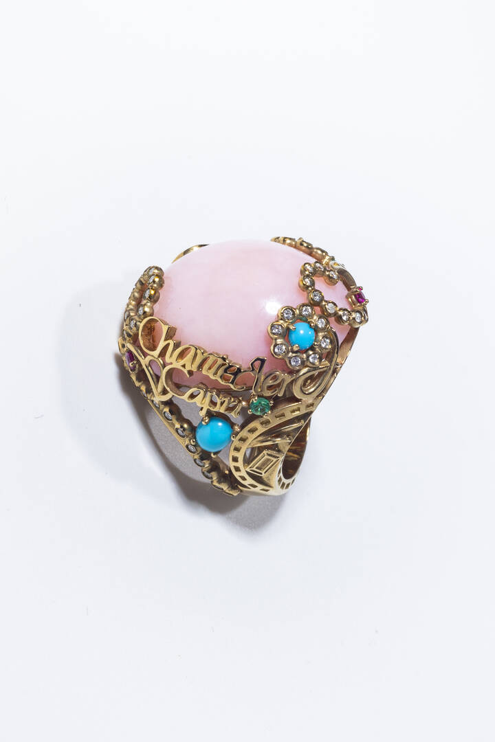 Anello in oro giallo 9 Kt, firmato "Chantecler", con grande opale rosa cabochon, turchese cabochon, zaffiri, rubini, smeraldi per totali ct 0,45 ca e diamanti taglio brillante per totali ct 0,30 ca.