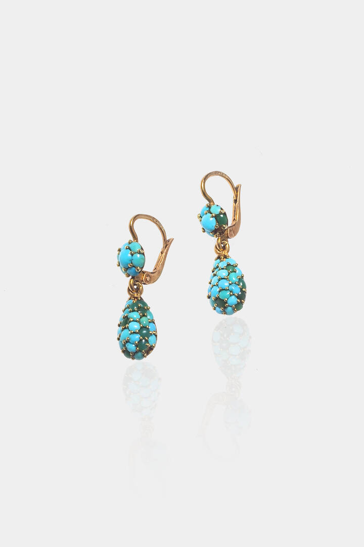 in oro 9 Kt, a monachella, anni '40, con gocce in sfere di turchesi (alcune virate, una mancante).