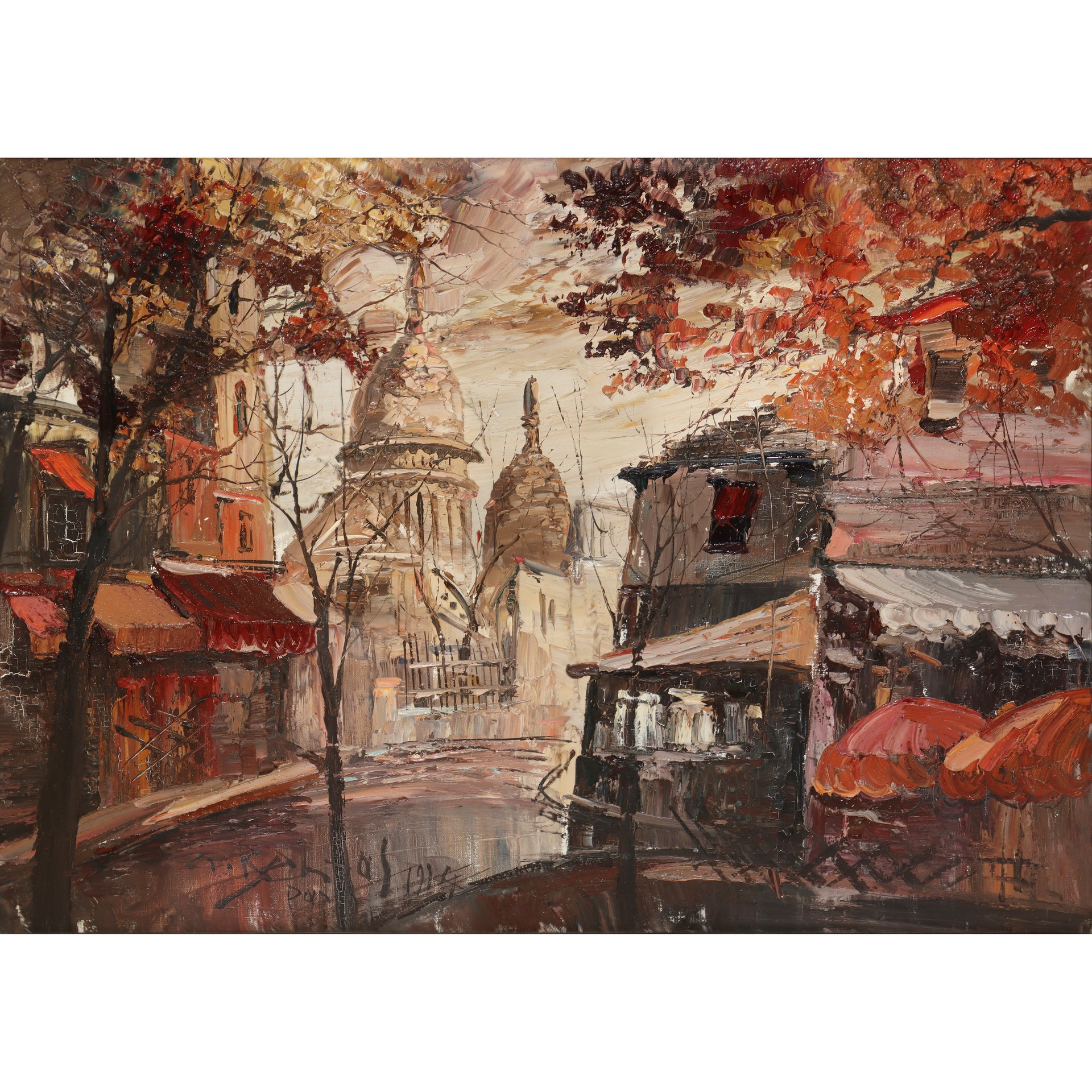 Georges Behras - Paesaggio parigino con la Chiesa di Montmartre, Montmartre, 1974 H cm 55x72 - in cornice H cm 63x81 Olio su tela Firmato al retro e datato
