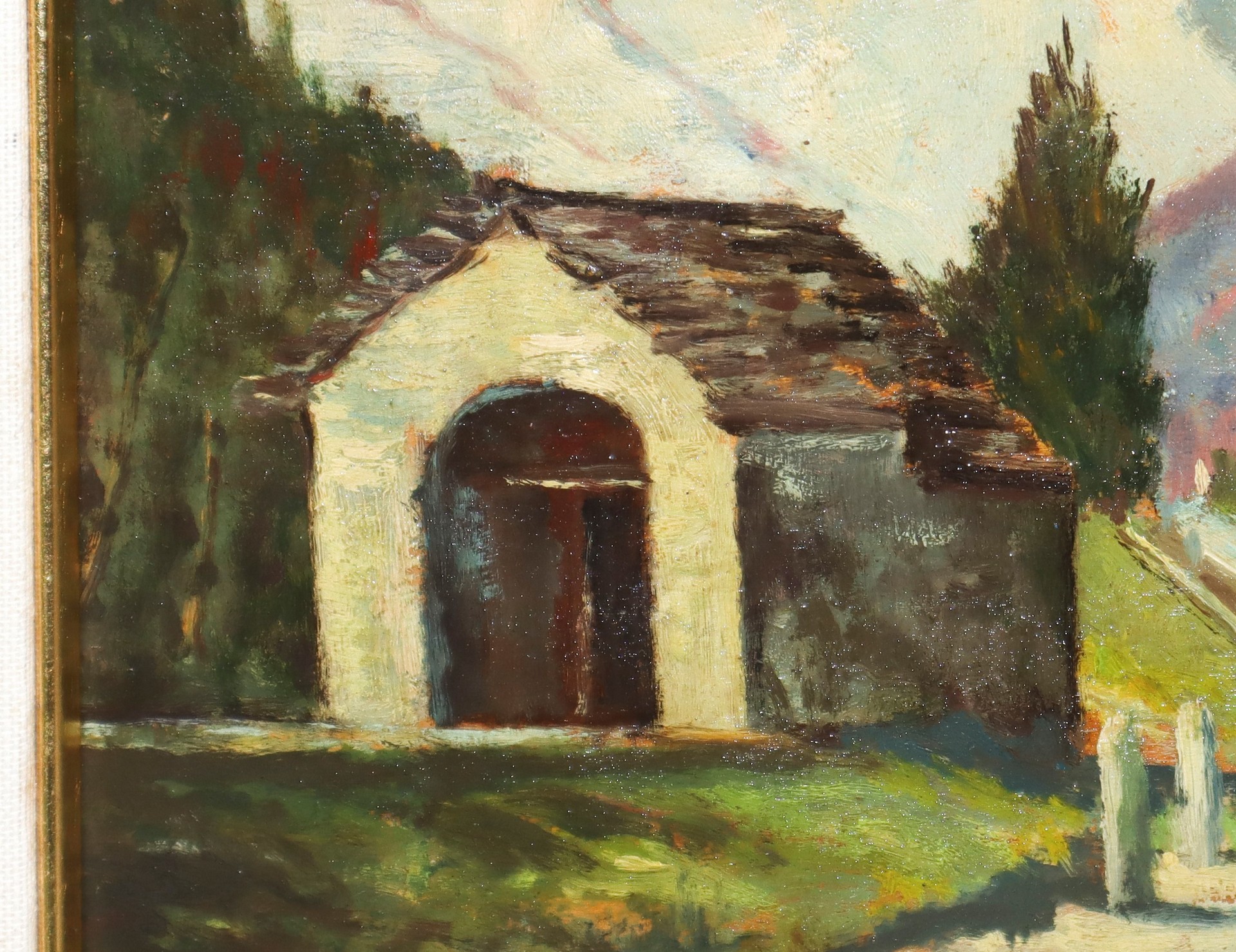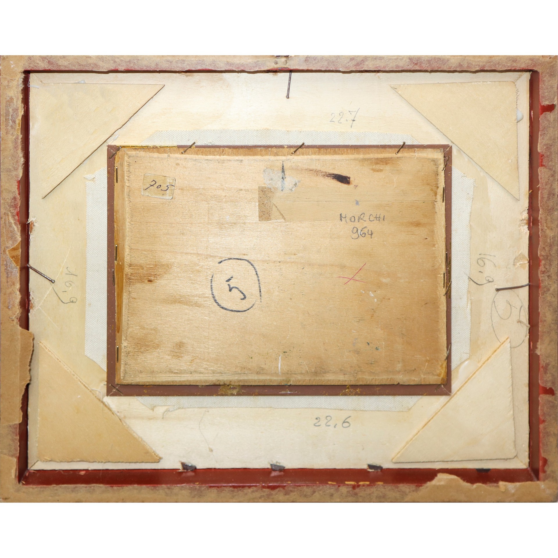 Paesaggio di montagna con casa, 1964 cm 17x23, in cornice cm 32x38 olio su tavoletta Firmato in basso a destra e sul retro indicato Morchi 1964