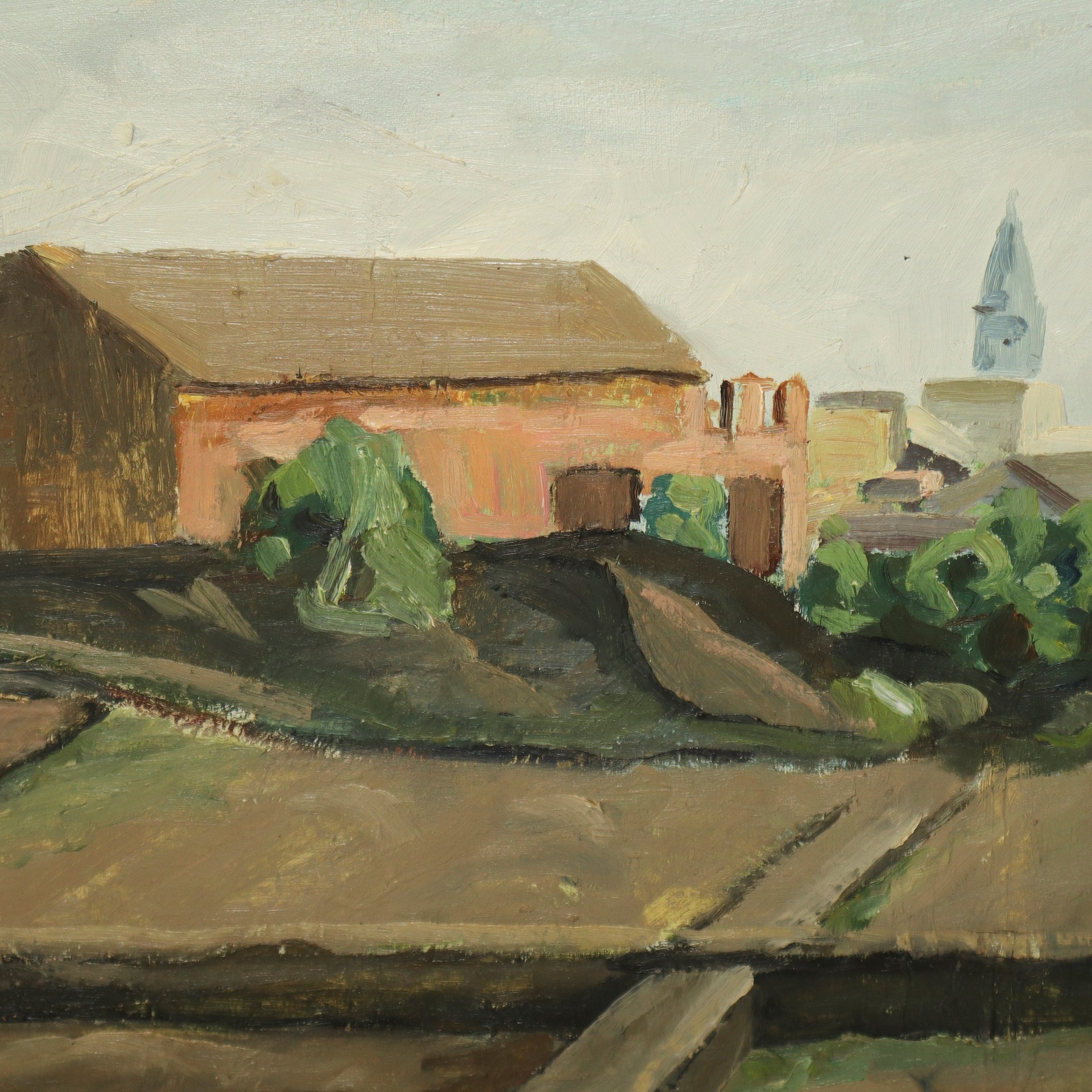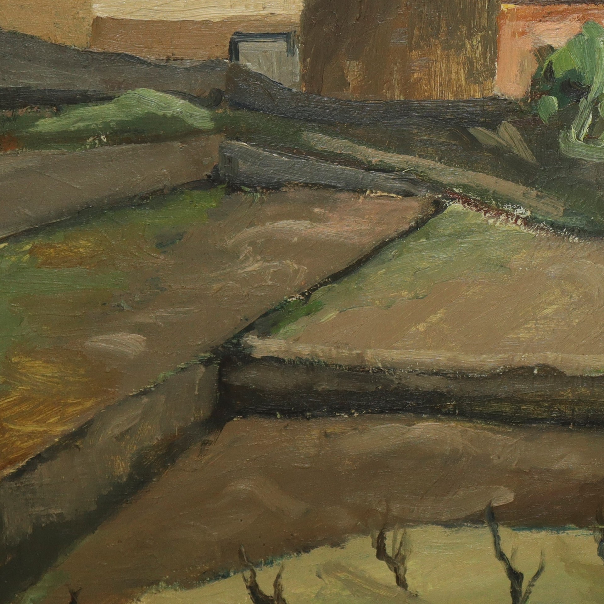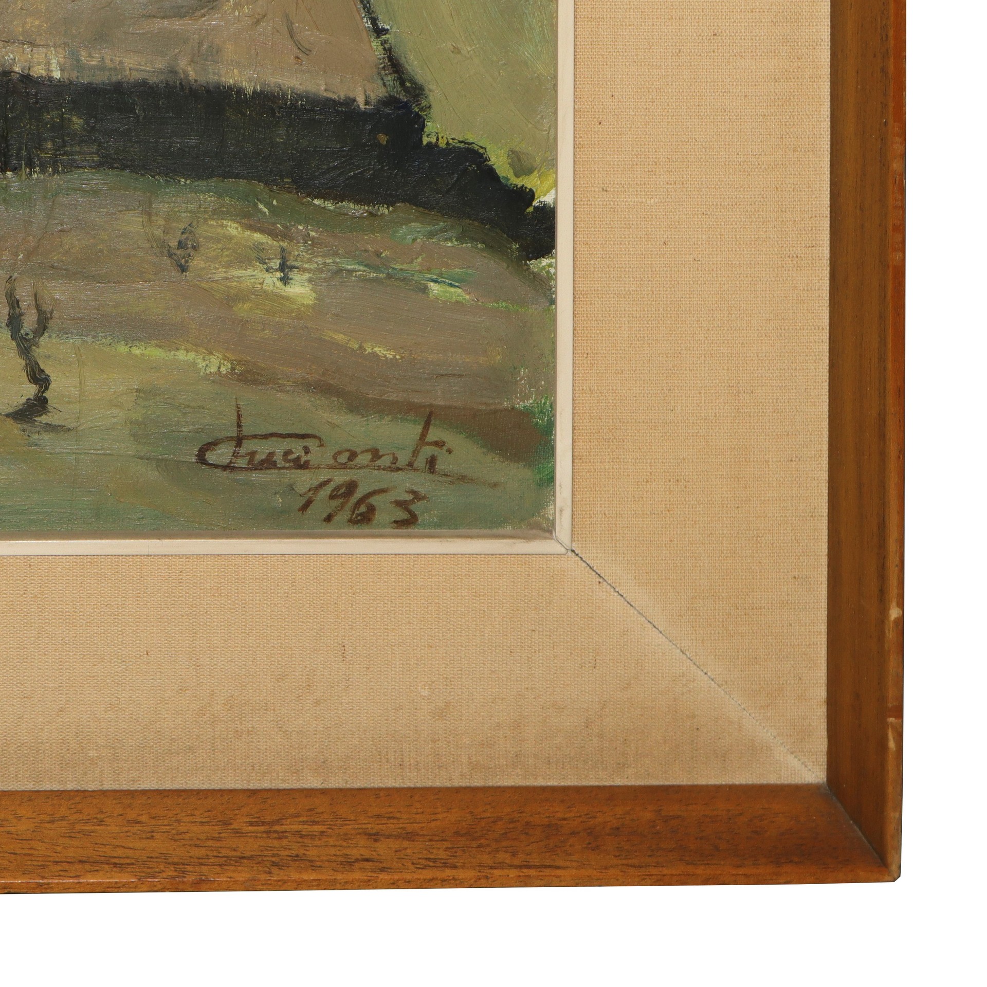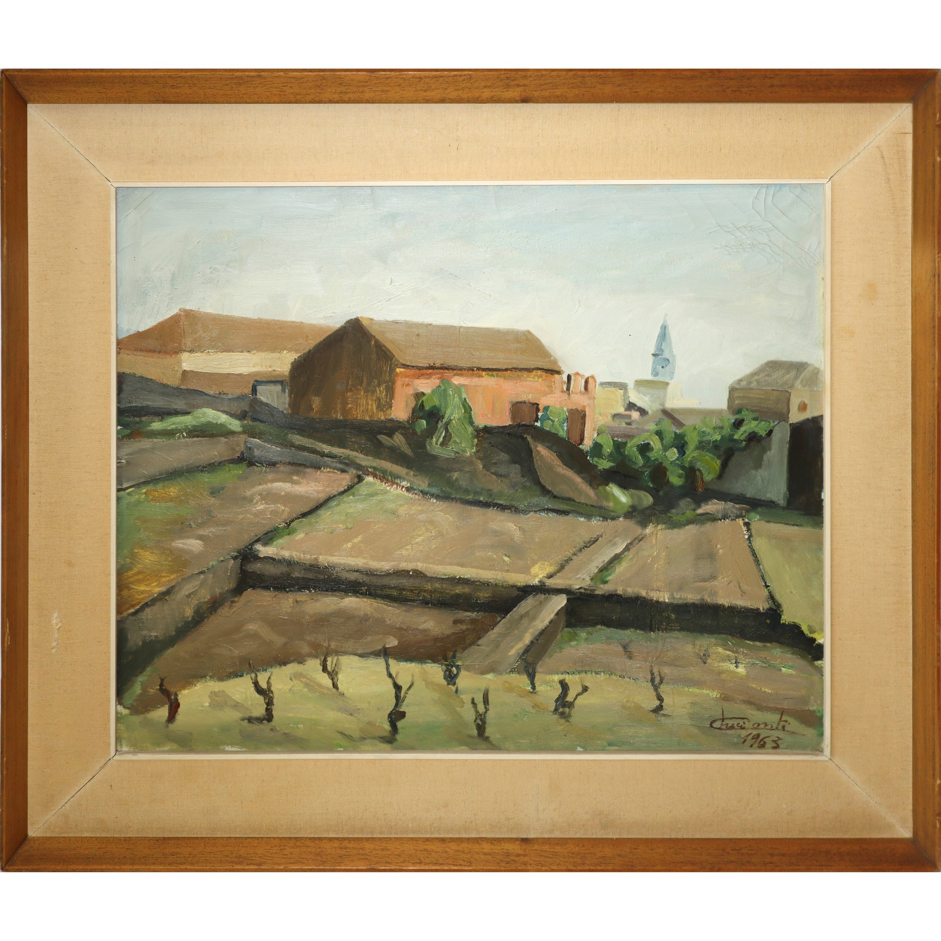 Paesaggio con case e tralci di vite, 1963 H cm 55x65 - in cornice H cm 74x85 Olio su tela Firmato in basso a destra