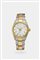 Cassa in acciaio con fondello vite e lunetta godronata in oro. Quadrante bianco con indici geometrici applicati. Bracciale in acciaio e oro rivettato con chiusura clasp. Movimento a carica manuale.