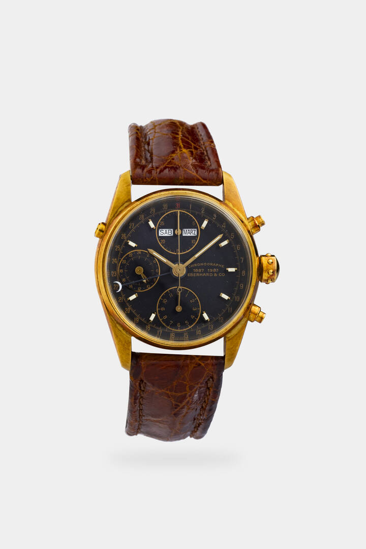 Cassa in oro con fondello avvitato e affascinante patina di ossido che ne testimonia l'inutilizzo pressoché totale. Quadrante antracite con indici geometrici luminescenti. Al 12 troviamo le finestrelle di giorno e mese concentriche con il contatore dei 30 minuti cronografici, al 6 l'indicazione delle 12 ore al 9 i secondi continui e le 24 ore, infine abbiamo una lancetta supplementare che indica la data ai limiti del quadrante.