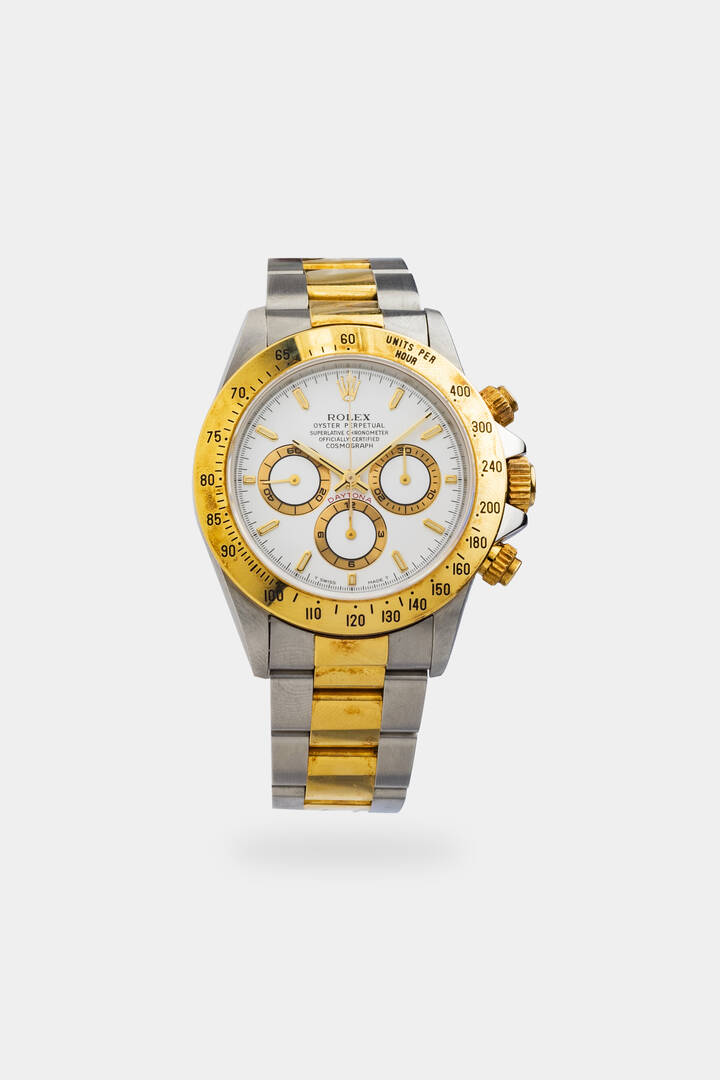 Cassa in acciaio con fondello a vite e lunetta tachimetrica. Quadrante bianco con indici geometrici applicati, indicazione dei secondi continui al 9, delle 12 ore al 6 e dei minuti cronografici al 3. Bracciale Oyster in acciaio e oro integrato con chiusura clasp.