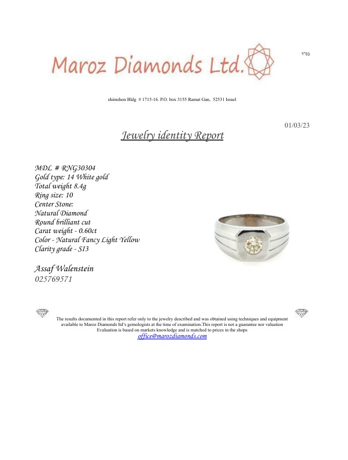 ANELLO IN ORO BIANCO 14K 8.4 GR CON DIAMANTE DA 0.60 CARATI COLORE FANCY GIALLO CHIARO PUREZZA SI3 TAGLIA 10 CERTIFICATO GEMMOLOGICO MAROZ DIAMONDS LTD MEMBRO ISRAEL DIAMOND EXCHANGE - RNG30304