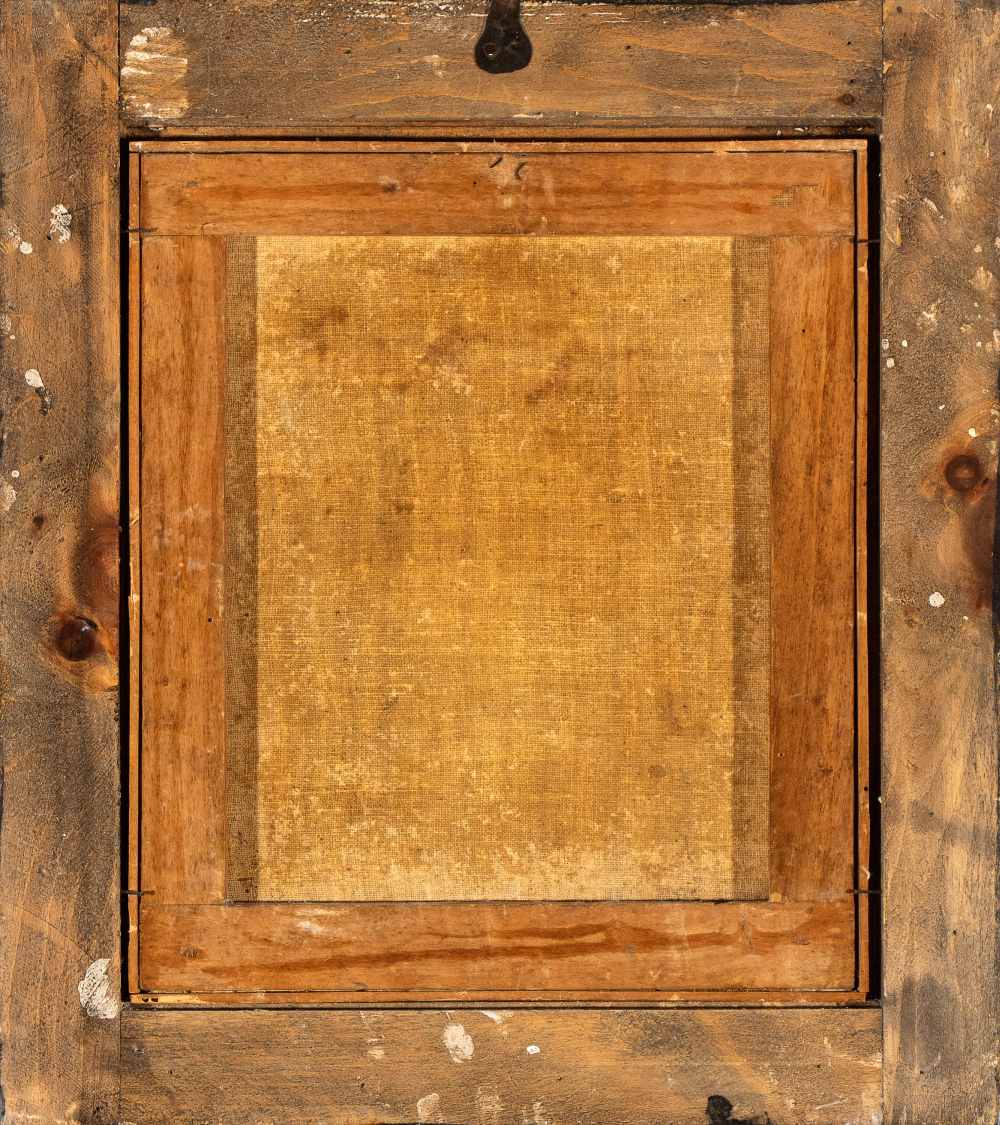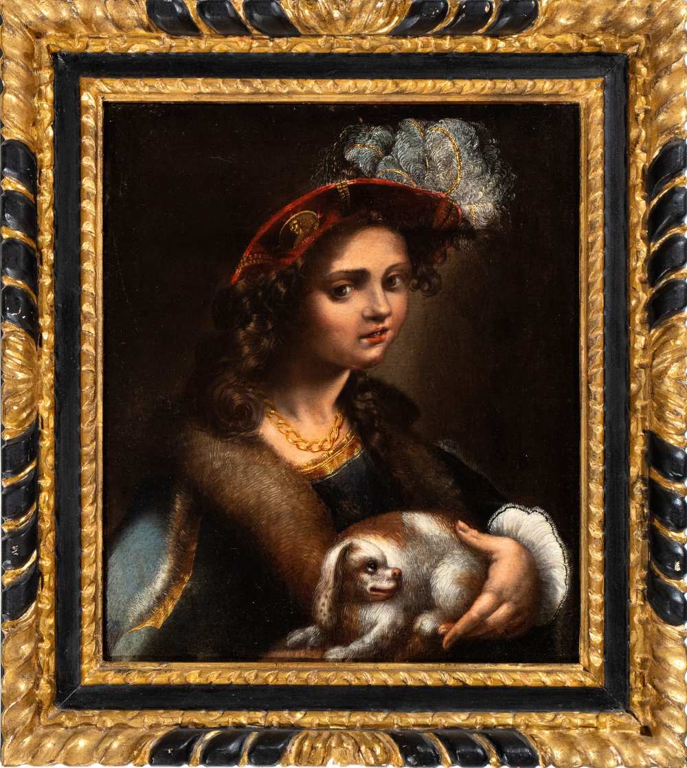Ritratto di gentildonna con cappello, pelliccia e cagnolino Olio su tela cm. 42x36. Con cornice