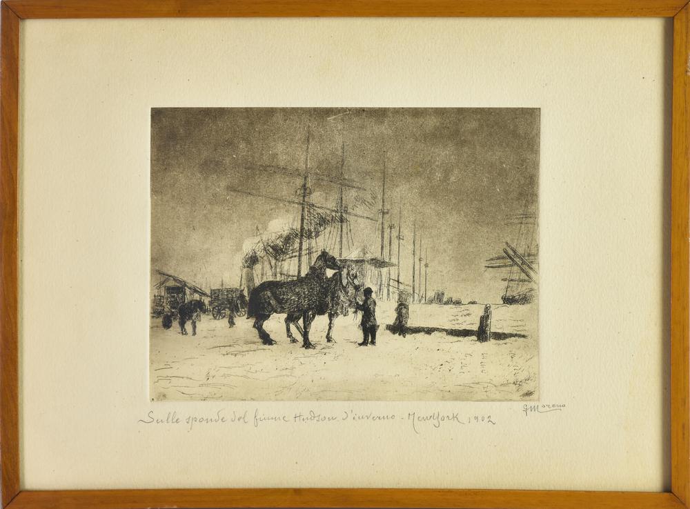 Lot 163 | G. Moreno SULLE SPONDE DEL FIUME HUDSON NEW YORK 1902 incisione, cm 15x20, su...