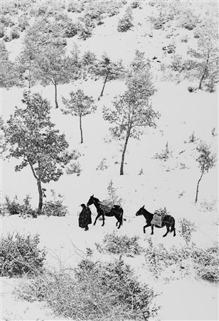 Si aspettava la neve in quel 1956 per poter realizzare con efficacia un libro monografico sull'Umbria che avrebbe poi pubblicato l'editore svizzero “La guilde du livre”, ma la neve tardava ad arrivare. Giunse improvvisa e Fulvio Roiter si precipitò dal suo Veneto a cercare le giuste inquadrature che avrebbero portato, come suggeriva il titolo “Umbria, Terra di San Francesco”, a interpretare la regione da un punto di vista insieme laico e spirituale. Un giorno, mentre con la corriera attraversava un tratto montuoso, vide un uomo che comminava con due cavalli al seguito. Impose con decisione al conducente una fermata non prevista e si precipitò con la sua Rolleiflex a riprendere la scena: la sua speranza era che l'uomo si allontanasse leggermente dall'animale per non sovrapporre confondendole le due figure e appena questo successe senza perdere un attimo scattò. Così l'ampia visione dell’incantevole paesaggio naturale che occupa gran parte dell’immagine divenne la cornice più adatta a inquadrare quelle tre piccole delicate figure scure che spiccavano sul bianco della neve e questa divenne la più famosa delle fotografie del libro.
