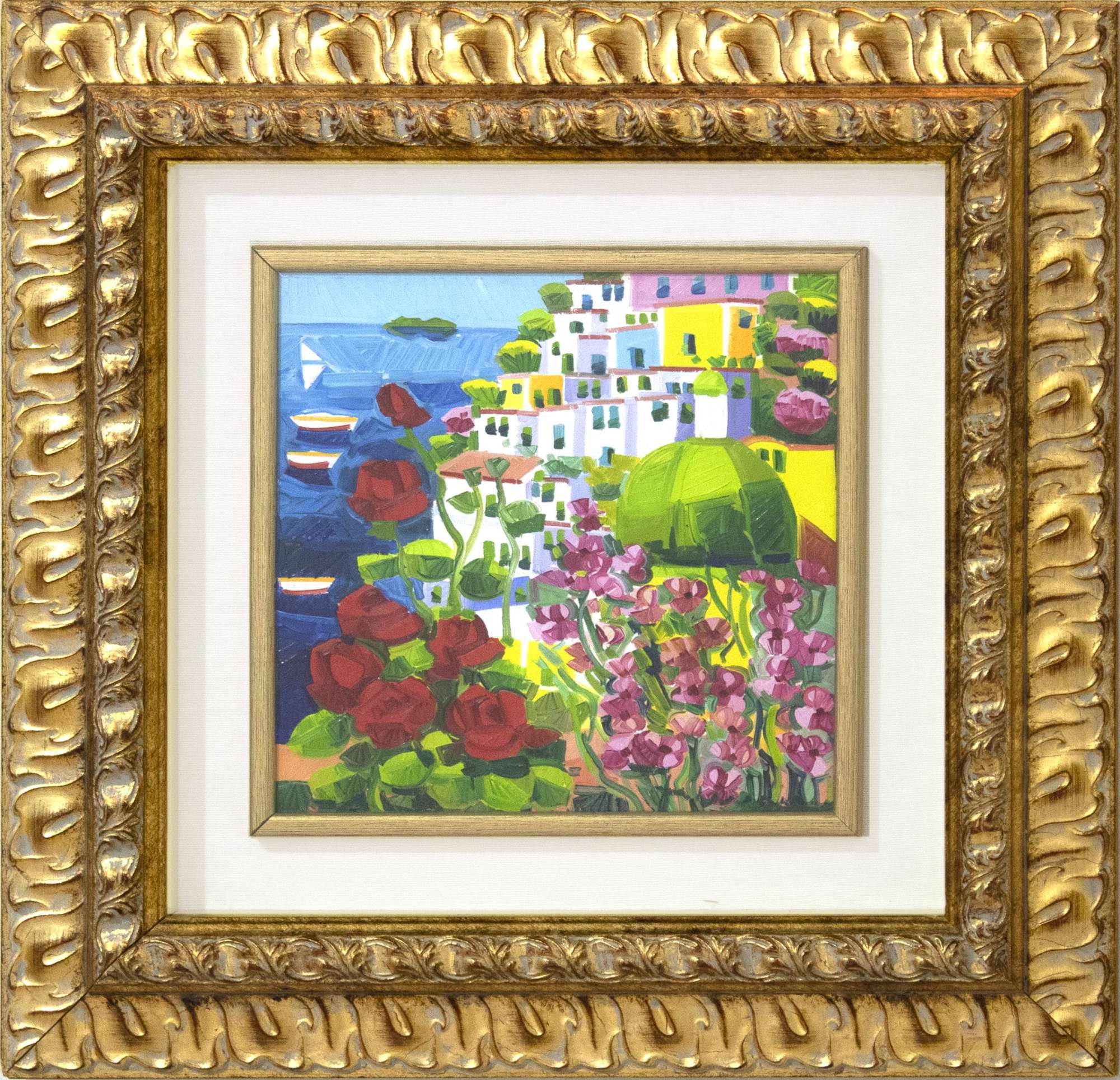 Athos Faccincani, Positano con rose rosse, 2005, olio su tela, cm 30x30, autentica a cura dell'artista