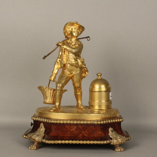 Carillon a forma di calamaio in bronzo dorato, con scultura raff. ''CONTADINO'' dalla testa estraibile utilizzabile come sigillo. Montato su base lastronata a marqueterie in bois de rose con finiture in bronzo. Doppia melodia. Marcato ALPH GIROUX ET CIE EDITEURS. Seconda metà XIX secolo. Mis. Lung. cm. 17 Alt. cm. 20 Prof. cm. 14 ca.