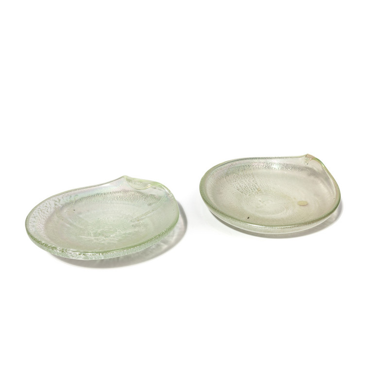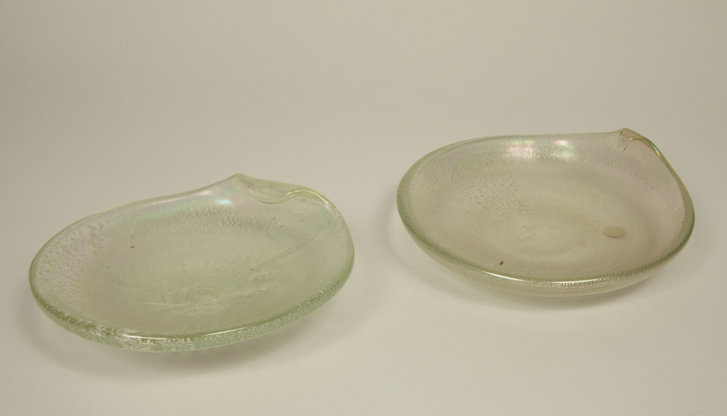 Due coppe 'conchiglia' in cristallo iridato con applicazione di foglia argento.