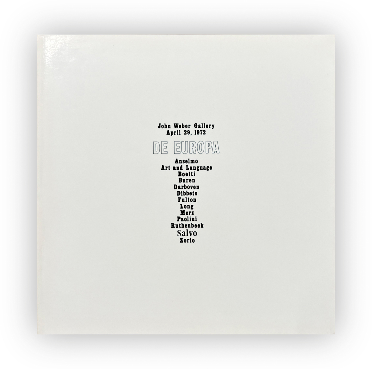 Catalogo riccamente illustrato edito in occasione dell'esposizione, organizzata in collaborazione con Gian Enzo Sperone e Konrad Fischer, tenutasi presso John Weber Gallery, New York, 1972 (opere di Anselmo, Art & Language, Boetti, Buren, Darboven, Dibbets, Fulton, Long, Merz, Paolini, Ruthenbeck, Salvo e Zorio)