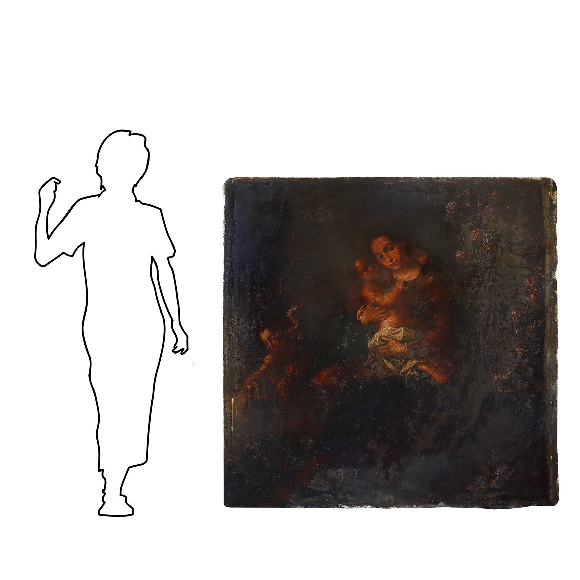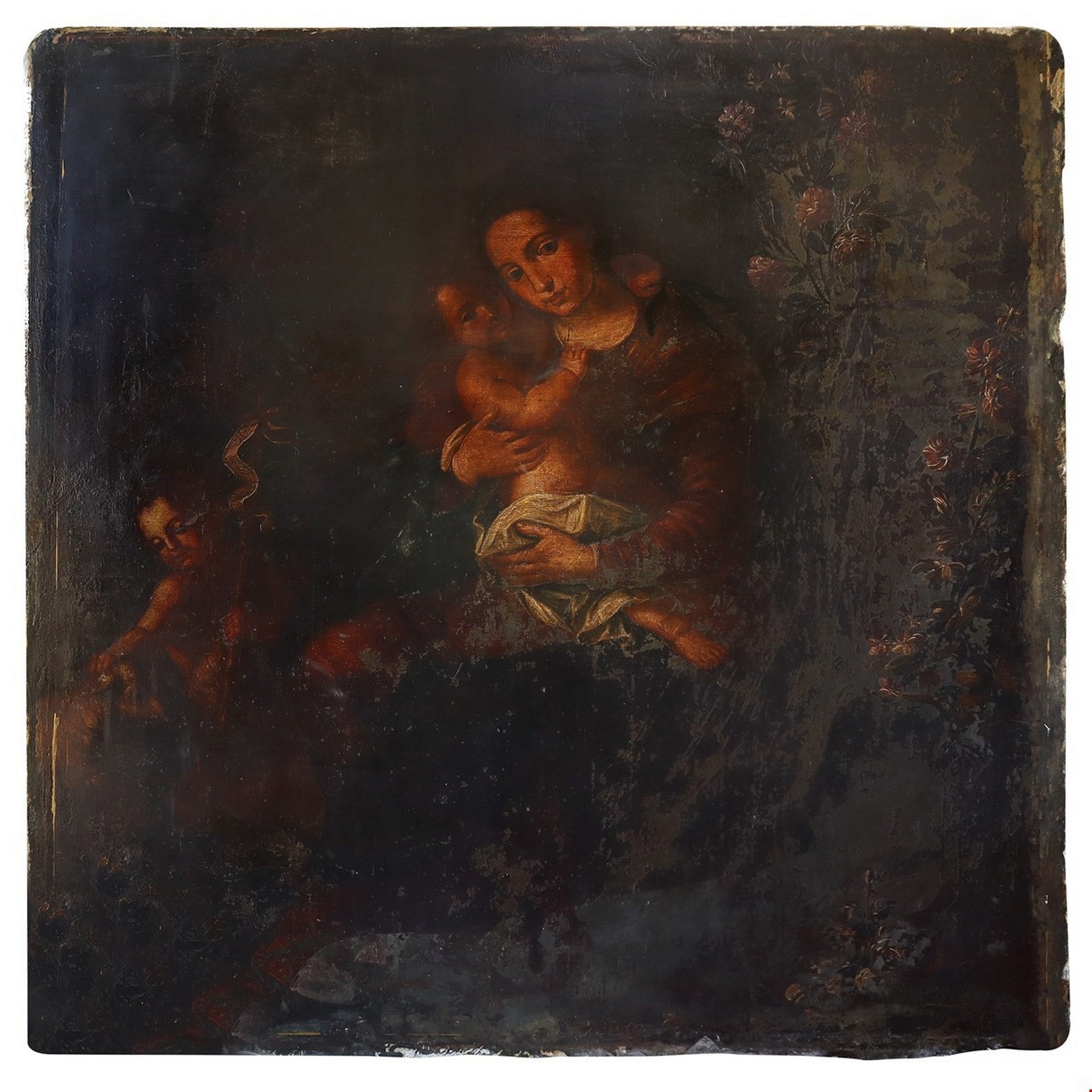 Giovanni Bernardino Azzolino (Cefalù 1572-Napoli 1645) - Madonna con Bambino e S.Giovannino, 16° secolo H cm 144 x148 Olio su ardesia Famiglie Maira di Palermo. Presente Experties del Professore Strinati Claudio: