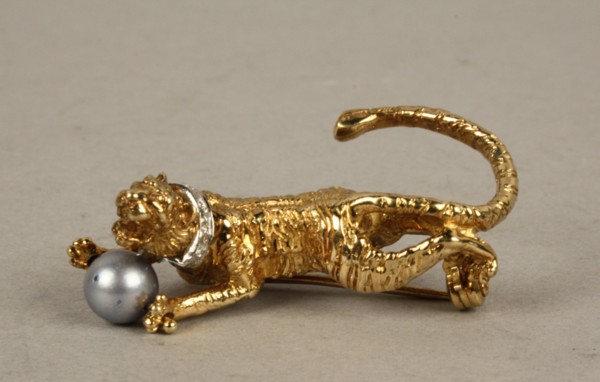 Spilla in oro giallo a forma di pantera con collare di piccoli brillanti e una perla tra gli artigli, gr. 15 ca. XX secolo.