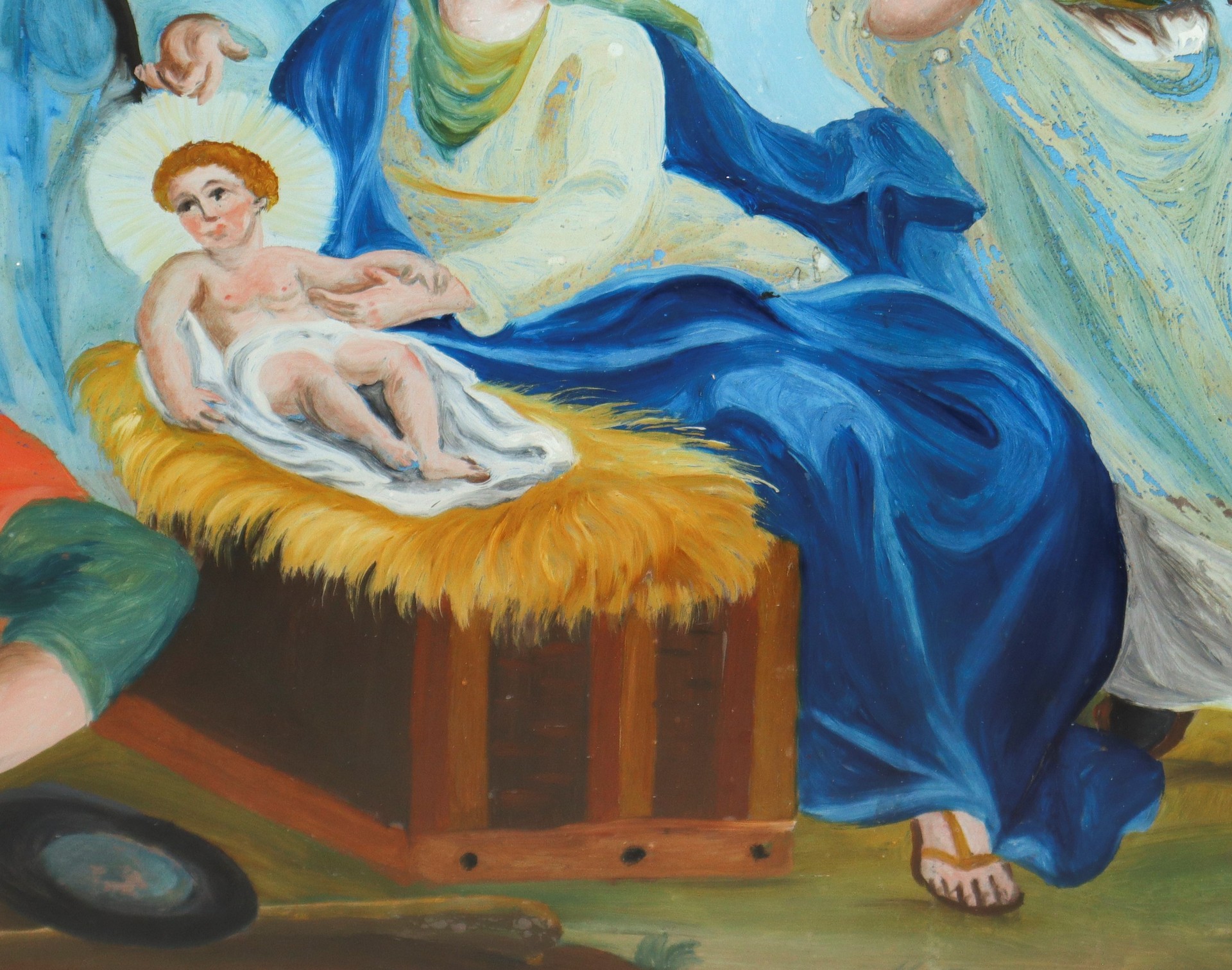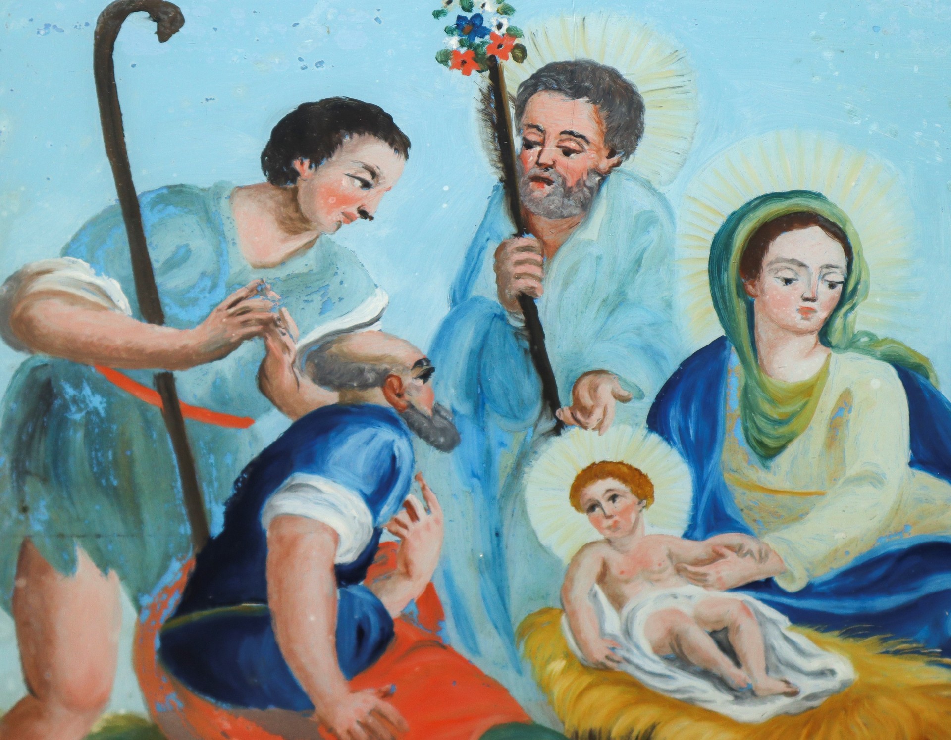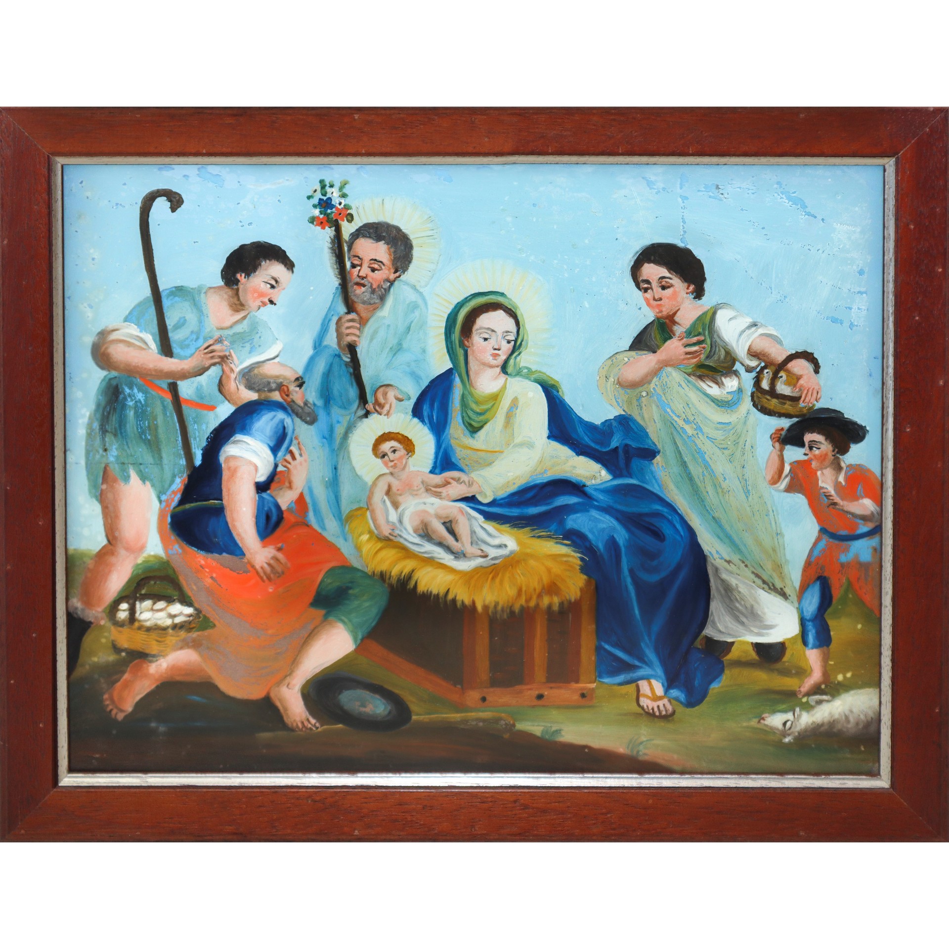 Adorazione dei pastori, fine 19° secolo H cm 30x39.5 - in cornice H cm 37x45 Pittura su vetro Sicilia