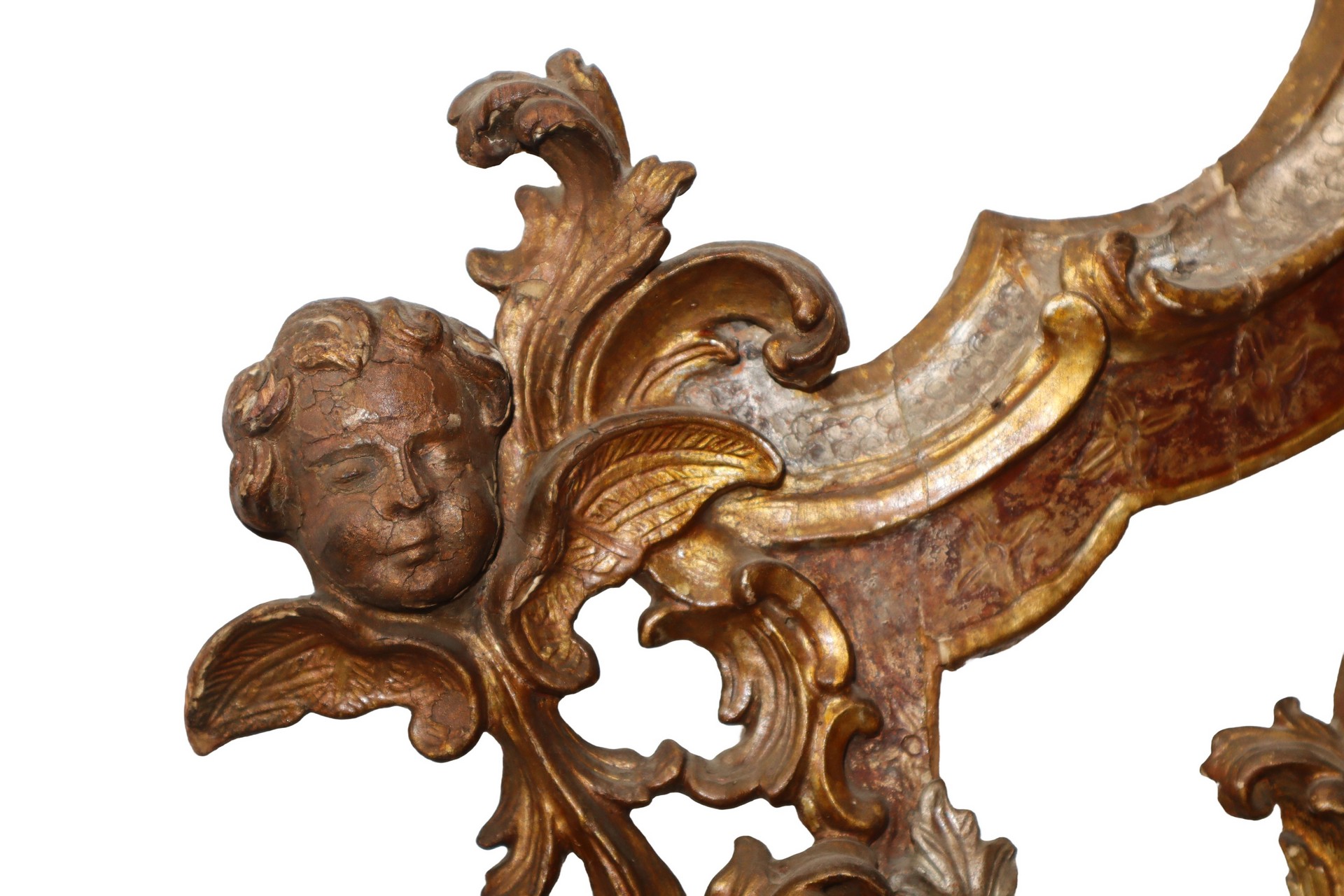 Fregio Luigi XIV laccato e dorato con riporti floreali argentati, primi 18° secolo H cm 115x76 Scolpito con testine di putti ai lati e intagliato con fregi di carattere floreale in oro e in argento.Scolpito con testine di putti ai lati e intagliato con fregi di carattere floreale in oro e in argento.